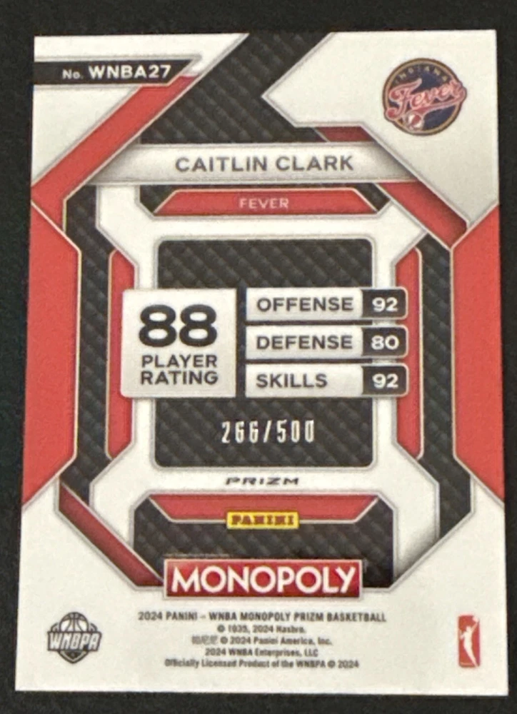 Sport: Basketball Set: Prizm Monopoly Type: Sports Trading Card Player/Athlete: Caitlin Clark Team: Indiana Fever Manufacturer: Panini Season: 2024 Parallel/Variety: Prizm Features: Rookie, Parallel/Variety, Insert, Serial Numbered Autographed: No League: Women's National Basketball Association (WNBA) Card Number: WNBA 27
