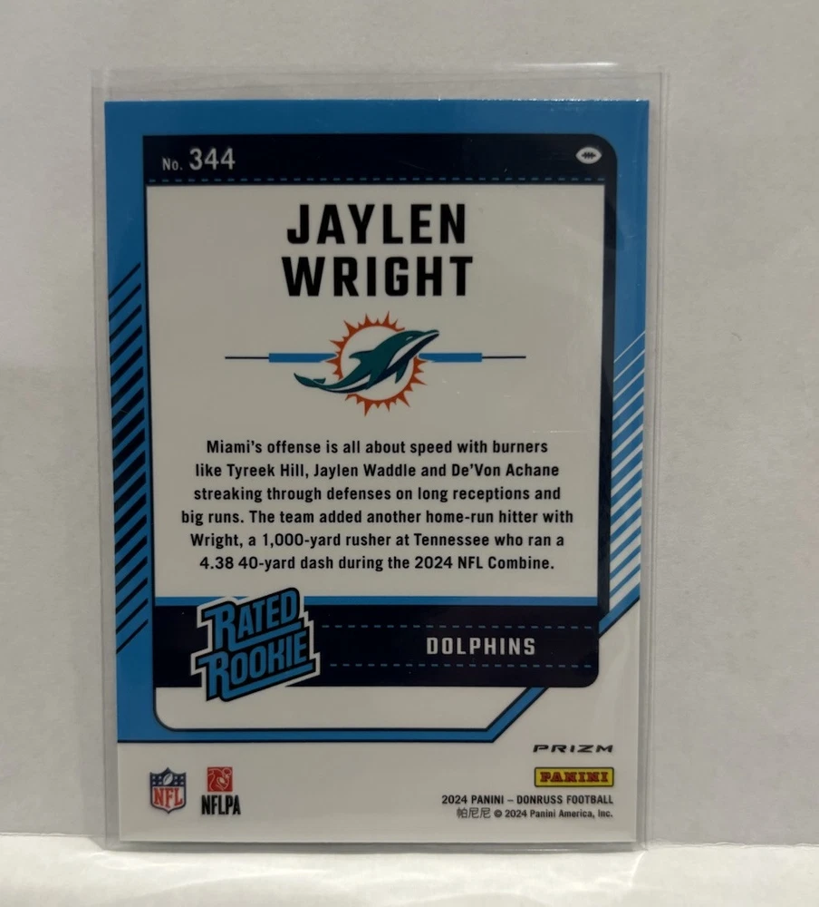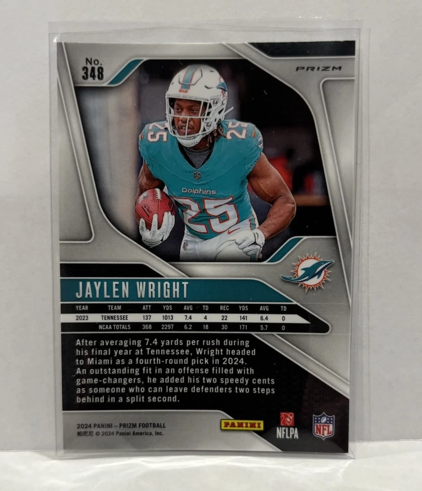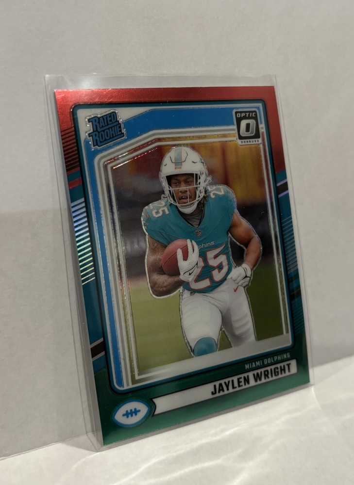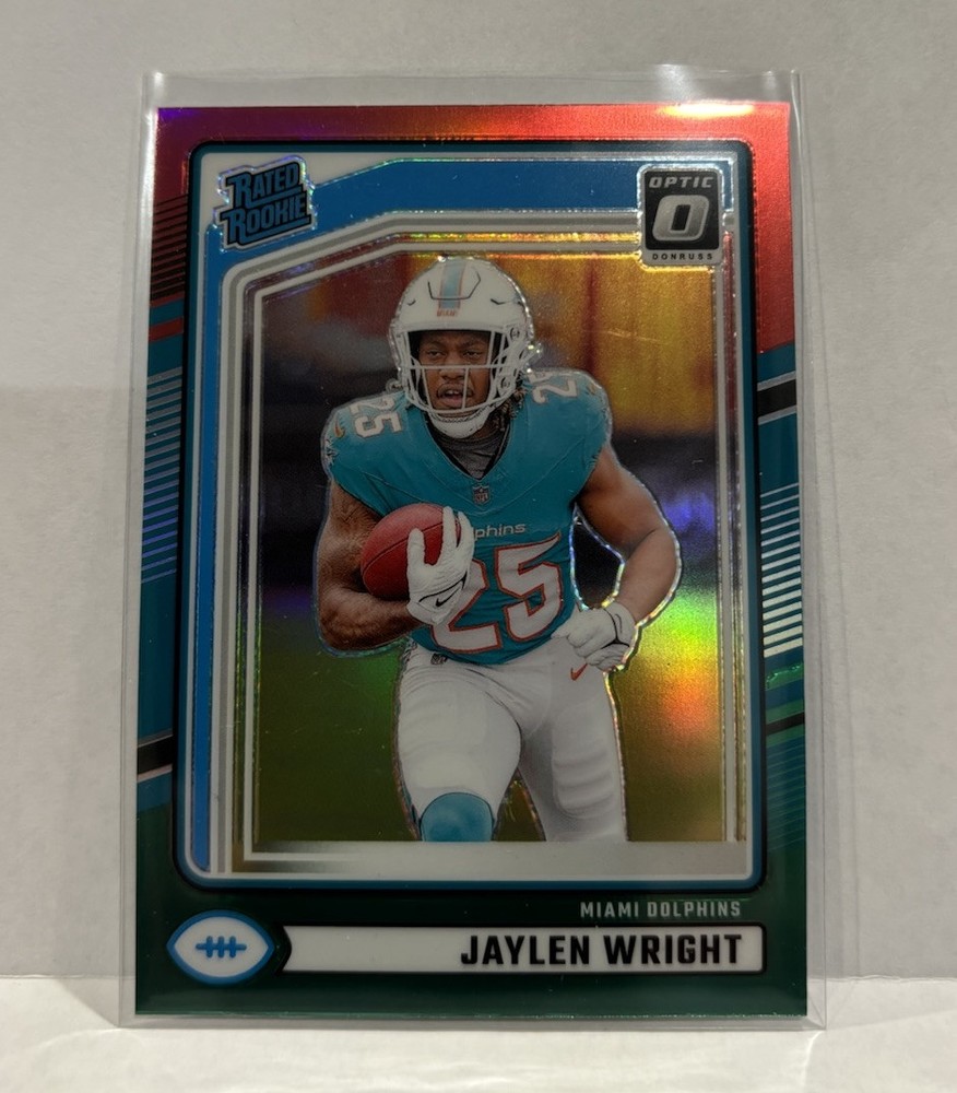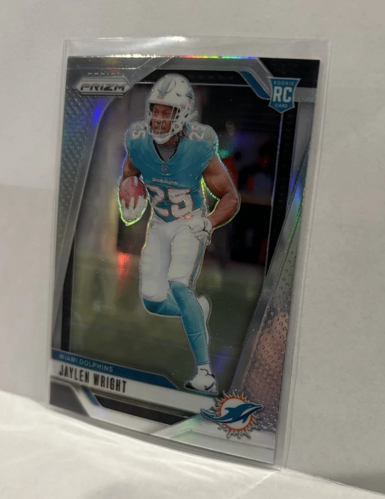 Enhance your sports card collection with this 2024 Prizm Parallel LOT featuring Jaylen Wright. The lot includes Optic Red Green and Silver #344 #348 cards, making it a perfect addition to any Miami Dolphins fan's collection. The cards are made of high-quality card stock and are original, licensed prints from Panini. The cards are in standard size and feature Jaylen Wright, a promising talent in the National Football League (NFL). The cards are perfect for trading or displaying, and they will make a great addition to any sports memorabilia collection. Don't miss out on this opportunity to own a piece of sports history!