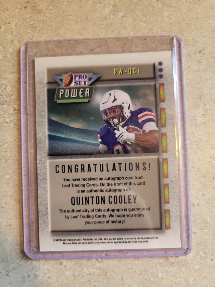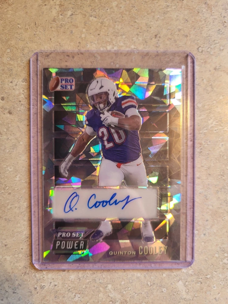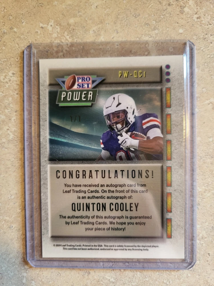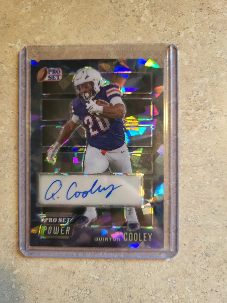 This rare and unique sports trading card features Quinton Cooley, a player from the Liberty Flames team in the National Collegiate Athletic Association (NCAA). The card is part of the 2024 Pro Set Metal and is one of only two cards produced, with the other card being a short print. The card is made of high-quality card stock material and features an authentic autograph from the player. It is also serial numbered and has a parallel feature, making it an exceptional addition to any sports trading card collection. This card is a must-have for fans and collectors alike and is sure to be a valuable and cherished item for years to come.