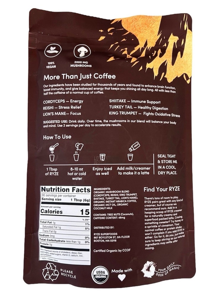 2024 New RYZE Organic Mushroom Coffee Pack with 30 Servings - Odor-Free