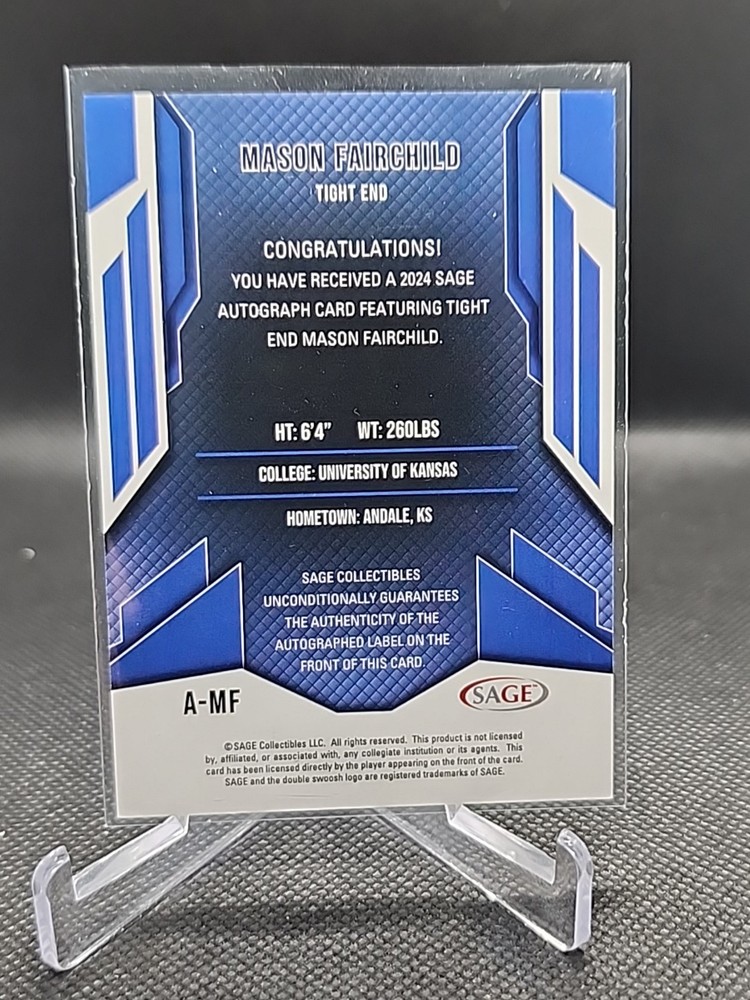 The product is a 2024 SAGE HIT Low Series trading card featuring an autograph of Mason Fairchild from the Kansas Jayhawks football team. It is a Gold parallel variety card with a print run of 100 copies. The card is serial numbered and is categorized as a rookie insert.