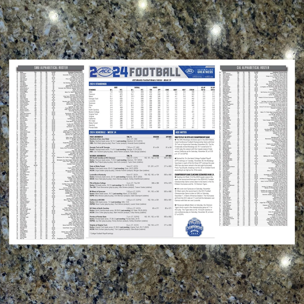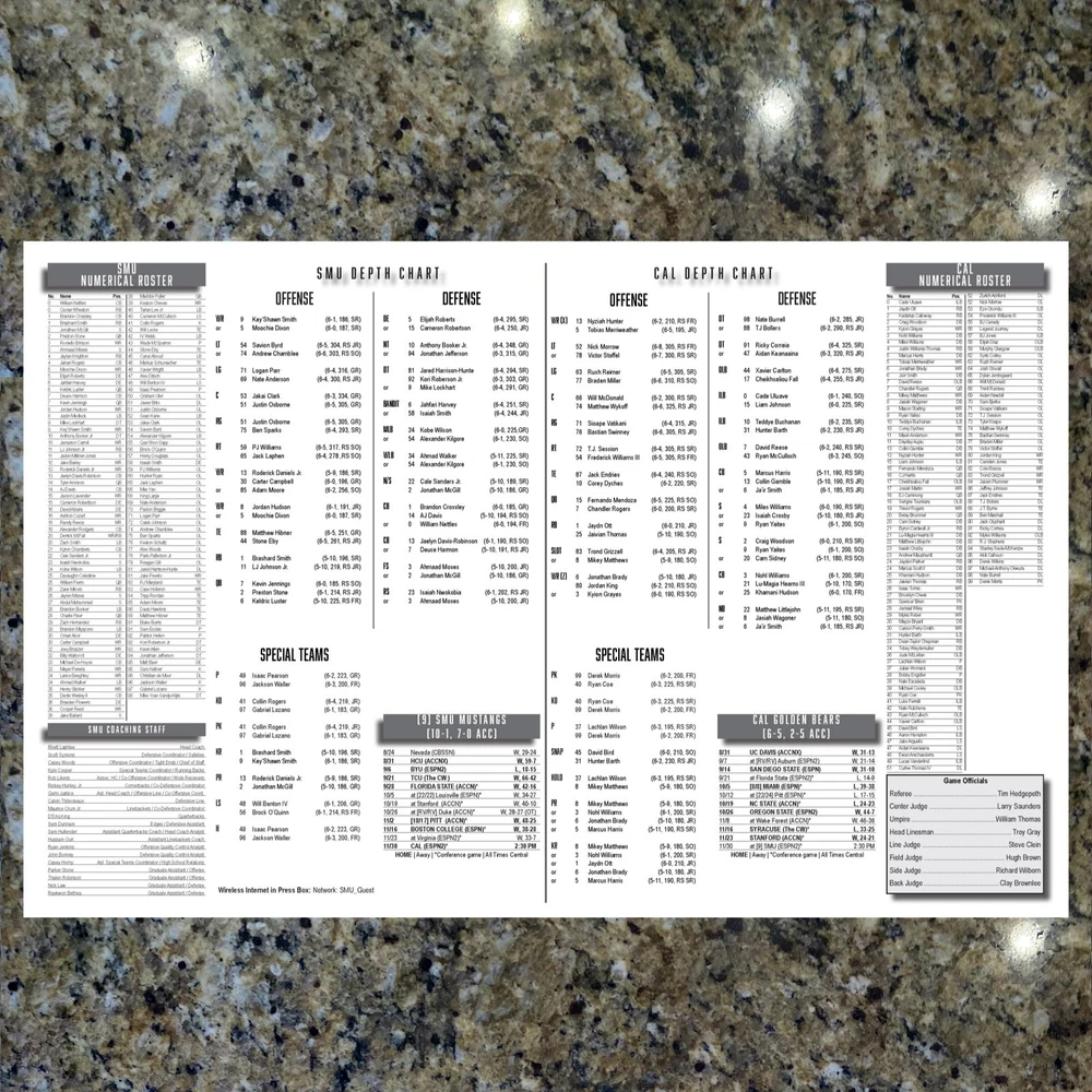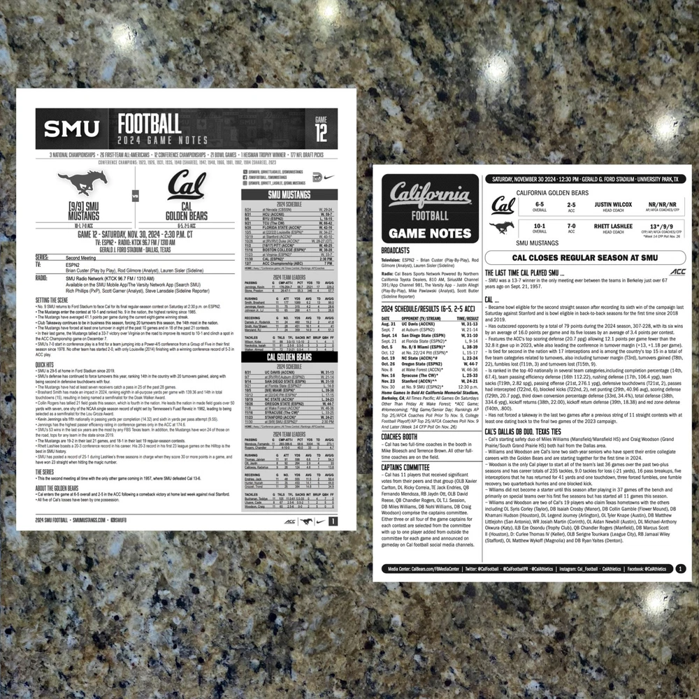 For sale, the game issued Flipcard and Media Program Notes for the SMU vs Cal game. Saturday, November 30, 2024. SMU now 11-1 are on to the ACC Championship and potentially the College Football Playoff. What you get: 1. 11x17 Game Issued Media Issued Flipcard - SMU vs Cal 2. SMU Media Program Game Note (1-page) 3. Cal Media Program Game Note (1-page) 4. Plastic protector sheet