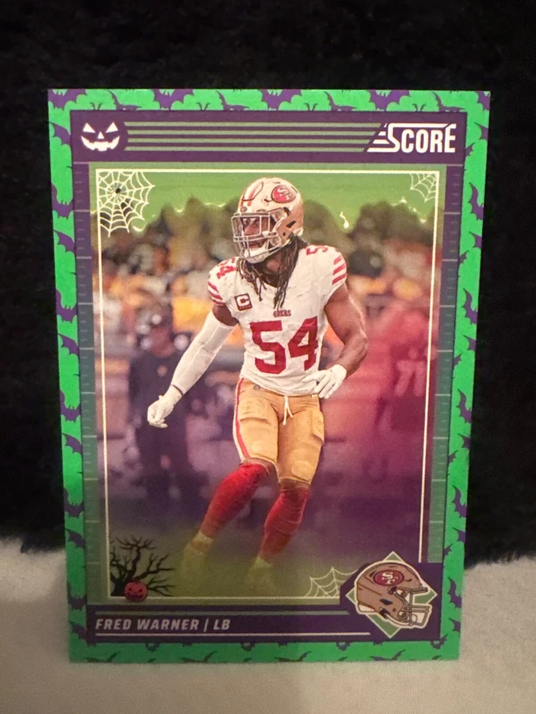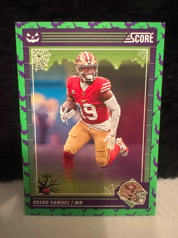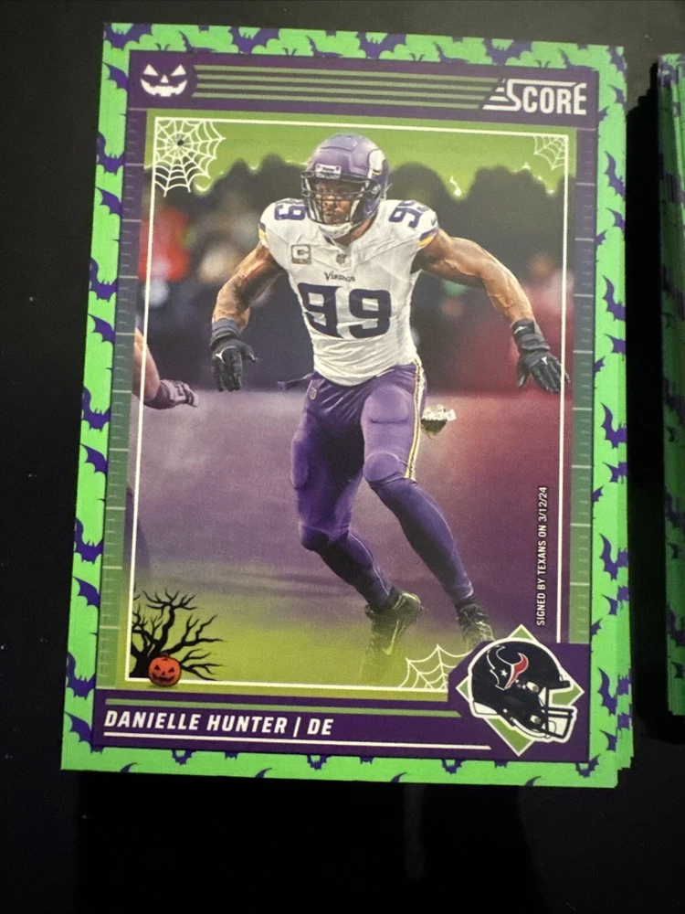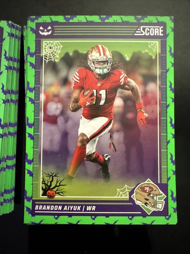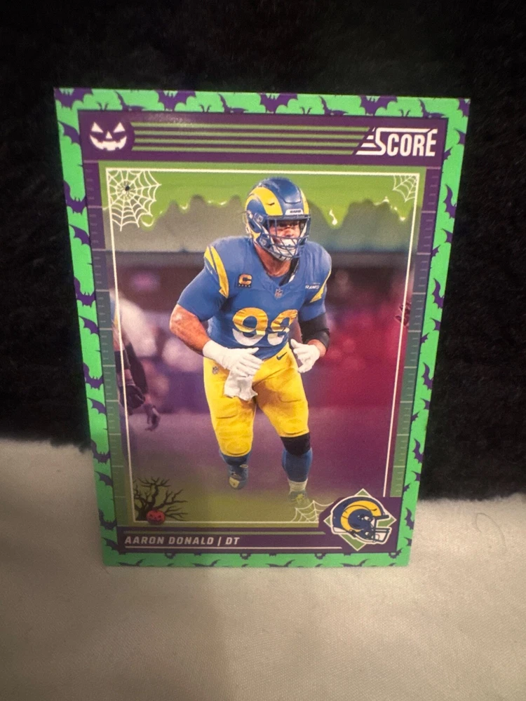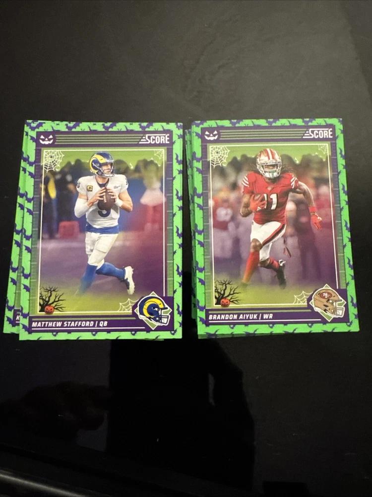 Complete your set of 2024 Score A Treat Football trading cards with the Green Bats parallel/variety. This card features some of the most exciting players in the National Football League (NFL), including Aaron Donald, Taysom Hill, and Randy Moss. The card is an original, licensed reprint from Panini and is part of the base set. The card number is 151-300 and it is a standard size for sports trading cards. The language is in English and the cards were manufactured in the United States. This card is a great addition to any football fan's collection, especially those who are fans of the San Francisco 49ers, Houston Texans, or Philadelphia Eagles.