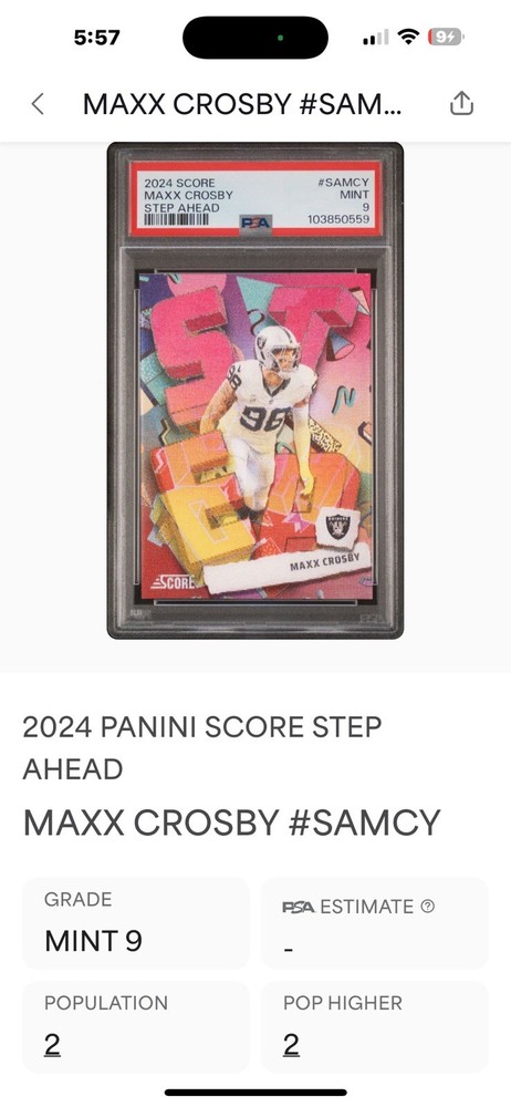 The product is a 2024 Score Max Crosby Step Ahead Linticular trading card featuring the Las Vegas Raiders player. This original sports trading card is part of the STEP AHEAD LINTICULAR insert set by Panini in the National Football League (NFL) theme. The card is made of card stock and includes hologram, short print, and exclusive features. It is a collectors edition with a lenticular design, making it a rare find as a PSA9 graded case hit with a population of 2.