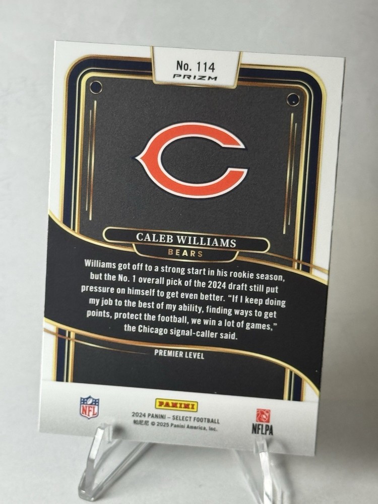 The product is a 2024 Panini Select Premier Level Caleb Williams #114 Red & Yellow Shock Prizm rookie card. This card is from the National Football League (NFL) and features the player from the Chicago Bears. It is a highly sought-after collectible for football fans and collectors alike, showcasing a unique parallel variety with vibrant red and yellow shock prizm design. As a part of the base set, this card is a valuable addition to any sports trading card collection.