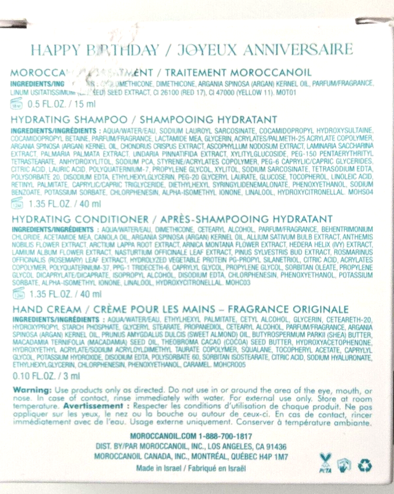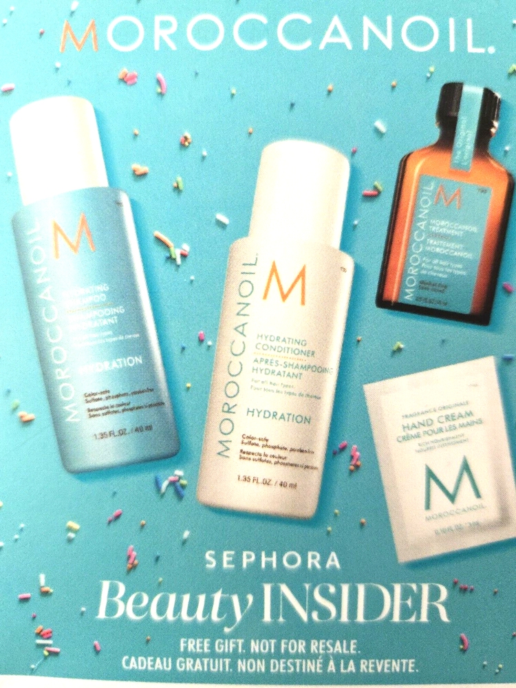 NEW SEPHORA BEAUTY INSIDER GIFT 2024 MOROCCANOIL + SHAMPOO + CONDITIONER + Cream Sealed box may have some wear from moving Morrocan Oil Treatment--.5 fl oz Hydrating Shampoo-- 1.35 fl oz Hydrating Conditioner-- 1.35 fl oz Hand Cream--.10 fl oz