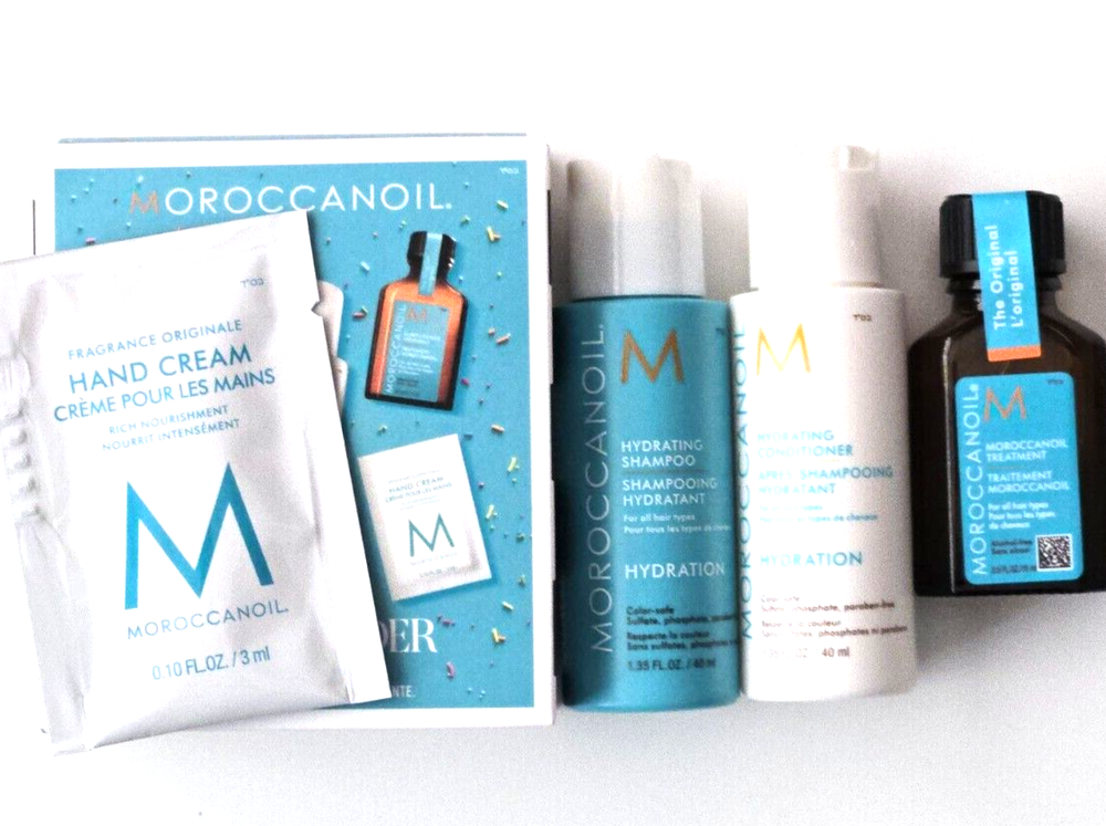 Styling Effect: Deep Conditioning, Moisturizing, Nourishing Features: Cruelty-Free/No Animal Testing, Paraben-Free Expiration Date: none indicated Hair Type: All Hair Types, Color Treated Hair, Damaged Hair Brand: Moroccanoil Formulation: Cream, Oil Department: Adult Type: SHAMPOO + CONDITIONER + TREATMENT + HAND CREAM Size: Travel Size Product Line: Moroccanoil Moisture Repair
