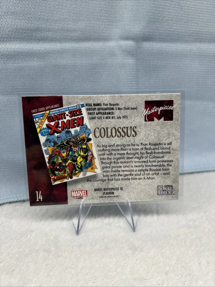 This is a 2024 Skybox Marvel Masterpieces '92 Platinum trading card featuring Colossus from X-Men. The card is part of the base set, manufactured by SkyBox in the United States. It is made of card stock and is in standard size. The card is in English language and is a non-autographed, non-sport trading card. It is numbered 14 in the set and is related to the Marvel (MCU) franchise.