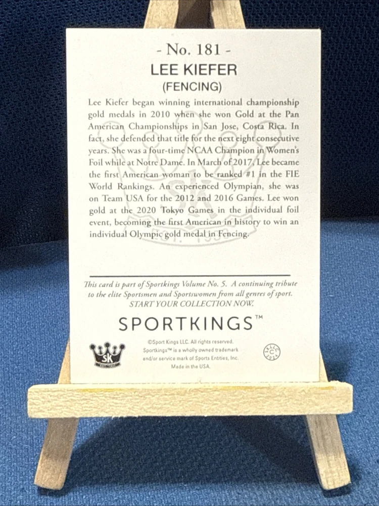 This 2024 Sportkings Volume 5 trading card features Lee Kiefer, a United States fencer who competed in the Olympic Games. The card is made of 20 Pt. card stock and has a blue border parallel/variety. It is an original, English-language sports trading card manufactured by Sport Kings for the 2024 season. The card is part of the base set and has the card number 181. It is a standard size trading card and is not autographed or customized in any way. This card is a great addition to any sports trading card collection, especially for fans of fencing and the Olympic Games.