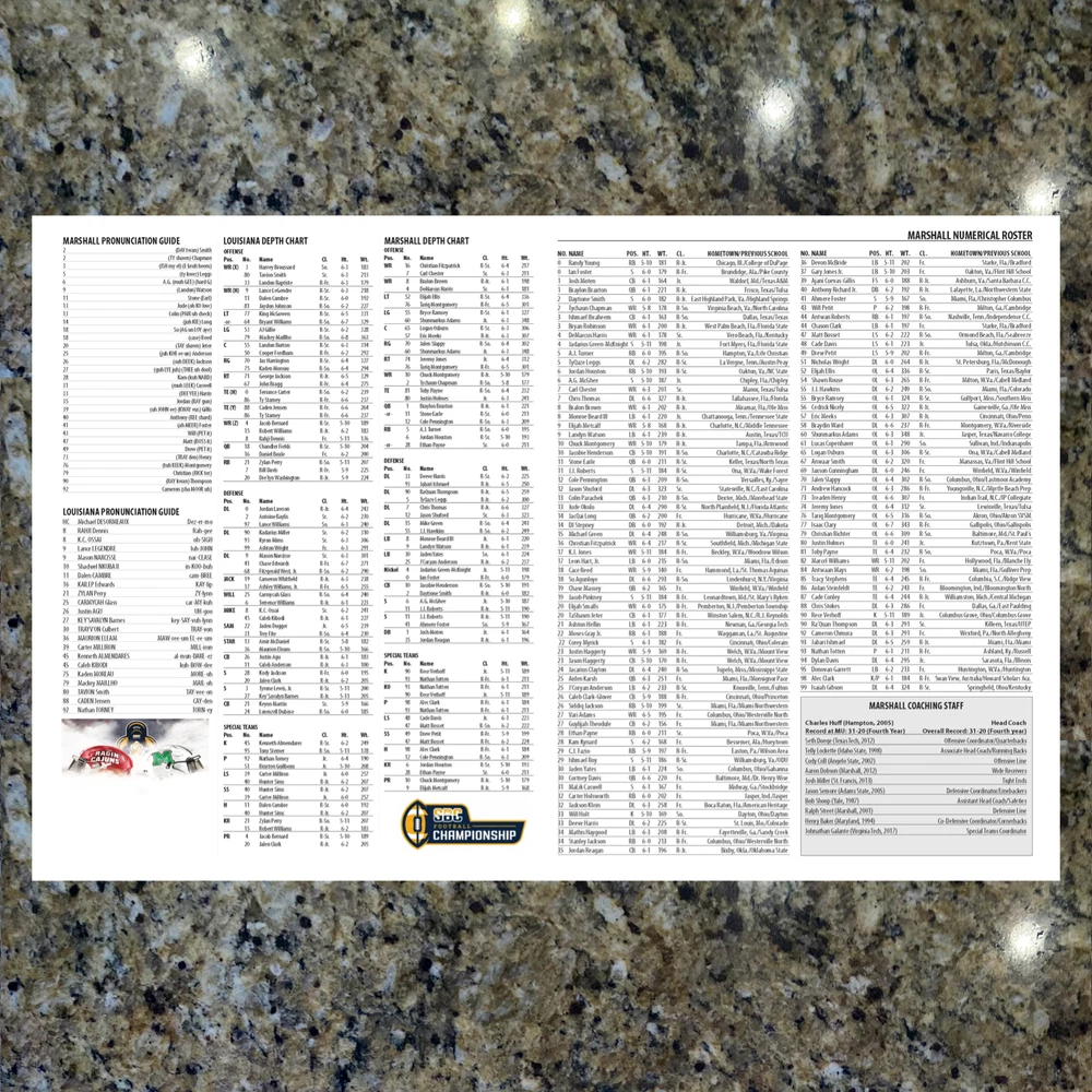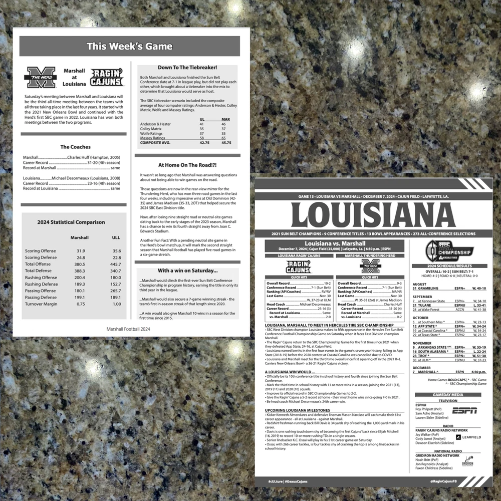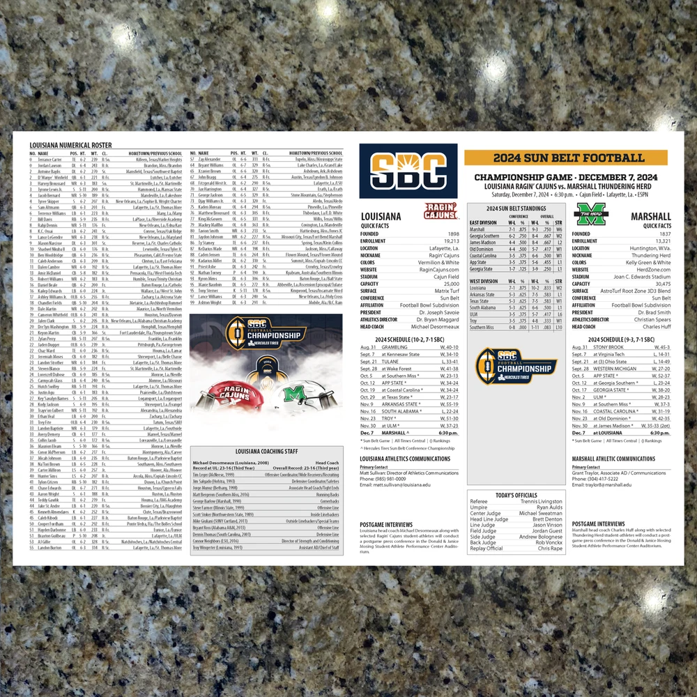 For sale, the game issued Flip card and team program notes from the 2024 Sunbelt Championship game - Marshall vs Louisiana at Cajun Field. Only given to media and broadcast for the game. History! GAME: SUNBELT FOOTBALL CHAMPIONSHIP GAME DATE: December 7, 2024 TEAMS: Marshall vs Louisiana Venue: Cajun Field Lafayette, La. What you get: 1. 11x17 Game Issued Media Issued Flipcard - Marshall vs Louisiana 2. Marshall game program note sheet (1 page) 3. Louisiana game program note sheet (1 page) 4. Plastic protector sheet