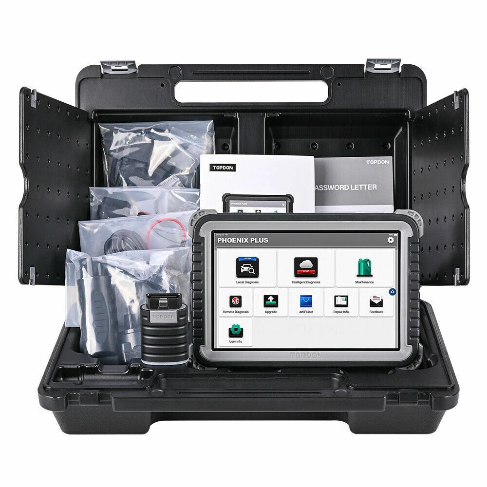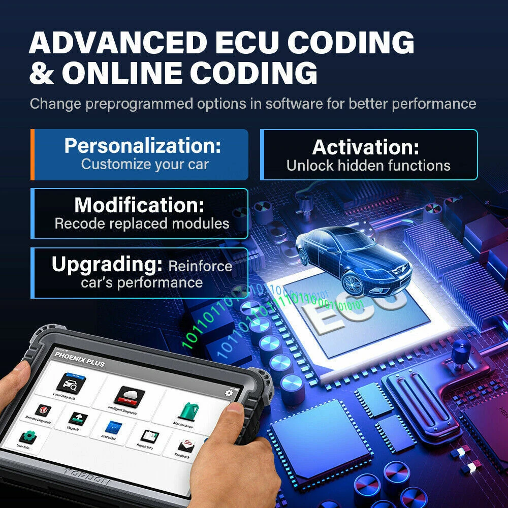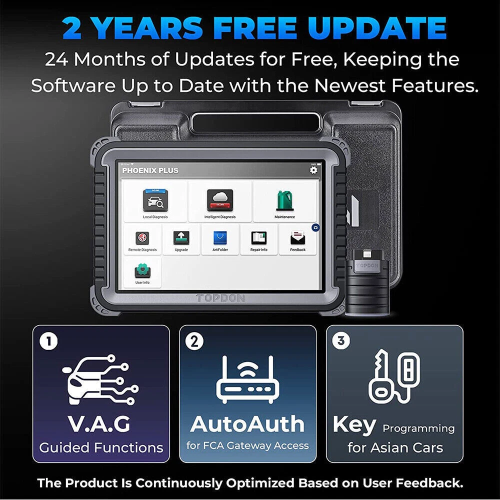 2024 TOPDON Phoenix Plus Car Diagnostic Scanner Tool Topology map Key Coding 2024 Topdon Phoenix Plus Full System Diagnostic Scanner with 2 Years Free Update --10-inch HD IPS Touch Screen+ Car full system Scanner +bluetooth/wifi +41+ Special service+ADAS Calibration+E~CU Coding+Active test+ Android 10 OS + 64GB Memory +Quad-Core 2.0GHz processor+ 2 Years free update online-- 2024 Topdon Phoenix Plus Professional Modular Diagnostic Tool CAR REPAIR SHOPS & MECHANICS 's First Choice !!! You Deserve to Have a Topdon Phoenix Plus 1.Powerful Quad-Core 2.0GHz processor with 4G+64G Hardware Configuration 2.OE-Level Wireless Intelligent Diagnostics, covering more than 100 car makes 3.Unique Modular Design, supporting up to 8 functional modules for any application scenarios 4.Android 10 OS running on 10-inch HD IPS Touch Screen 5.Supporting 41+ Service Reset Functions, more to cover soon 6.Topological Graph 7.Supporting ADAS Calibration 8.Remote Technical Support via TeamViewer 3. 41+ Special functions : Topdon Phoenix Plus supports matching, coding, programming of most vehicles' programable modules,and most commonly used maintenance and reset functions, namely, Oil Reset, Elec. Throttle Adaption,IMMO Service,Injector Coding,Break-pad Reset, Steering Angle Reset, ABS Bleeding,AFS Reset,Battery Matching,A/T Learning, DPF Regeneration, EGR Adaption, TPMS Reset, Sunroof lnitialization,Suspension Matching, Gear Learning, SRS Reset, ODO Reset, AdBlue Reset, A/F Reset,CoolantBleeding, Language Change, NOx Sensor Reset, Seat Calibration, Stop/Start Reset,Transport Mode,Tyre Reset, Windows Calibration. 4.12 Data Graphs shows in the Same Screen It is better you can compare and Analysis the Data , easy to find the problem of the car ! 5.AutoAuth Access, Communicate with FCA SGW without Bypass Cable Starting in 2018, FCA vehicles have been equipped with a security gateway firewall, i.e. SGW Authentication System (SGM) which is developed to secure the vehicle’s control systems against security threats and issues. Yet now you can communicate with the FCA SGW Authentication System and bypass the SGM with our diagnostic tool TOPDON Phoenix Plus to be able to run OE-level diagnostics and bi-directionals on SGW-equipped vehicles: Available for 2017 and later FCA vehicles including Chrysler, Dodge, Jeep, Alfa Romeo, and Fiat. Your Phoenix Plus diagnostic tablet needs to have the AutoAuth subscription. The diagnostic scanner needs to have the latest version of diagnostic software. The scan tool must be connected to the internet to communicate with the FCA SGW Authentication System. **There’ll be yearly subscriptions fees required by AutoAuth. 6. Actuation Test: This function is used to test whether the execution components in the electronic control system can work 7. E~CU CODING: The Coding function is used to re-flash the vehicle control modules, it allows you to reprogram adaptive data for certain components after making repairs or replacements. Support Full system diagnostic Engines/Auto Transmission/SRSs/Immobilizer/Key Coding/ABS/Cruise Control/Instruments/ Self Leveling Suspension systems/Seats/Doors/Gateway/Steering Angle/Air Suspension/Body Systems/Electronic Power Steering & Motor Assisted/Power Steering/Tyre Pressure/Rain Sensors/4WD System/Stabilizer/Intelligent Parking Assist/Door Motors/Audio Systems/Air Conditioning/Tiptronic/Anti Theft/Soft Top/Headlamp Leveling/Central Locking/Automatic Clutch/ DPF Reset/Electric Windows/Plip Programming/Heated Rear Window/Xenon Headlights/Wash Wipe/Fuel Burning Heater/Transfer Box/Seat Memory/Oil Life Service Reset/Sliding Doors/Electronic Throttle/Navigation System/Rollover Sensor/Cruise Control/ Multi Function Steering Wheel/Aux Heating/Electronic Parking Brake/Clutch Electronics etc.( Great for car repair shops and mechanics to improve business) Service functions Topdon Phoenix Plus has 28 service functions which allows you to reset various systems in your vehicle. support more function than other scanners priced similarly : 1.Oil Reset The lightening of the car maintenance light indicates that the vehicle needs maintenance.Reset them ileage or driving time to zero after the maintenance, so the maintenance light will go out and the system will start a new maintenance cycle. 2.Elec.Throttle Adaption Elec. Throttle Adaption is to utilize the car decoder to initialize the throttle actuator so that the learning value of the E~CU returns to the initial state.By doing these, the movement of the throttle (or idle motor)can be more accurately controlled, thus adjust the intake volume. 3.Steering Angle Reset To reset the steering angle, first find the relative zero point position for the car to drive in straight line.Taking this position as reference, the E~CU can calculate the accurate angle for left and right steering.After replacing the steering angle position sensor, replacing steering mechanical parts (such as steering gearbox, steering column, end tie rod, steering knuckle), performing four-wheel alignment, or recovering car body, you must reset the steering angle. 4.Battery Matching This function enables you to perform a resetting operation on the monitoring unit of vehicle battery, in which the original low battery fault information will be cleared and battery matching will be done. 5.ABS Bleeding When the ABS contains air, the ABS bleeding function must be performed to bleed the brake system to restore ABS brake sensitivity. lf the ABS computer,ABS pump, brake master cylinder, brake cylinder, brake line, or brake fluid is replaced, the ABS bleeding function must be performed to bleed the ABS. 6.Break-pad Reset lf the brake pad wears the brake pad sense line, the brake pad sense line sends a signal sense line to the on-board computer to replace the brake pad.After replacing the brake pad, you must reset the brake pad.Otherwise, the car alarms. 7.DPF Regeneration DPF regeneration is used to clear PM (Particulate Matter) from the DPF filter through continuous co
