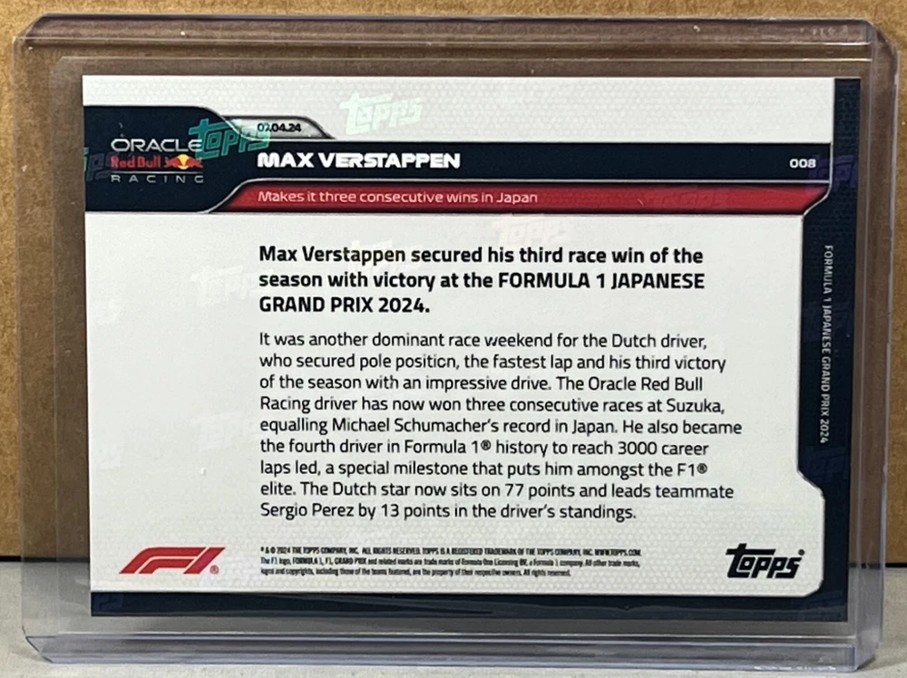2024 TOPPS NOW FORMULA 1 F1 #8 MAX VERSTAPPEN makes it three consecutive wins in Japan Red parallel serial #'d 11/99. Worldwide shipping available. U.S. - Winning bidder to add $4.99 for careful USPS first class shipping with delivery confirmation. Add .50 for each additional item. All other countries - ship costs are calculated by eBay through international shipping program. Please message if interested in multiple items. Bid with confidence, 49000+ feedback. Thanks and check out my auctions ending every Sunday. Please note that combined ship rates are for items paid for on one invoice, thanks!