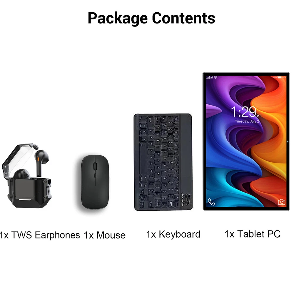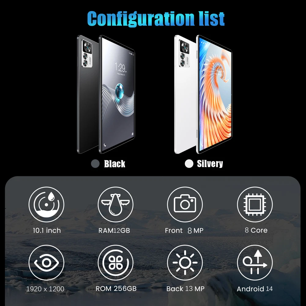 30-Day Warranty Free returns and exchanges 10 Point Inspection All of our equipment undergoes strict inspections before shipment to ensure that we can provide customers with the highest quality. 5+ Years experience In our cooperation system, all suppliers are outstanding in the industry and have more than 5 years of experience. This means more reliable quality, more efficient service, and more stable supply. US warehouse Delivery within 2-6 days 100% Functional Suppliers conduct quality inspections on over 100000 devices every month, and only devices that have passed strict quality control and obtained 100% approval will be put into the retail market. return policy Why Choose Us? Fault issues 1.All of our products support a 30 day no reason return policy. 2.If your purchased device is found to have defects or quality issues, we will be happy to provide replacement parts and returns within 30 days of receiving delivery. 3.If you need to return a defective device, please contact us directly so that our customer service can purchase a return label. 4.We do not recommend initiating a return request as the processing time for ebey is relatively slow. 5.Once the warehouse receives and verifies the item, we will issue a refund or send a replacement. 6.If you are not satisfied with or do not like your purchase, please select “I do not like this item” as the reason for return. Selecting the “I don't like this item” return reason does not affect your right to return the item. It also helps our customer service team better understand your needs and purchase a return label for you and you don't need to pay any fees. 7.We kindly remind you that we do not provide a 30 day no reason return or exchange service for products that are self damaged Payment Policy F Shipping Policy Once we receive your order, we will process it. We will ship your order within 24 hours after receiving it and provide tracking numbers for all orders. Shipping may be delayed on weekends and holidays, but will be shipped within 48 hours. Please note that tablet accessories sent to Puerto Rico cannot be delivered. We hereby inform you Warranty 9All of our products come with a 30 day no reason return policy, and we proudly support the quality of our products. If the device you purchased is found to have defects or problems, we will be happy to provide replacement parts and returns within 30 days of receiving delivery. If you need to return a defective device, please contact us directly so that our customer service can purchase a return label. We do not recommend opening a return request because the processing time for ebey is relatively slow. Once the warehouse receives and verifies the item, they will refund you and send replacement parts. We kindly remind you that we cannot provide a 30 day no reason return service for self damaged products Why Choose Us? We have solemnly signed a 5-year agreement with the supp lier, with a firm determination to directly compress the price to the lowest possible p rice. We strictly control the profit of each tablet to not exceed 8%. Just to present the most cost-ef fective products to users, striving to make it easy for everyone to have cheap and high-quality tablets, and let th e light of technology illuminate everyone's life FAQ 1. Regarding GPS, our tablet can basically meet the needs of most users in daily usage scenarios (such as map navigation, finding nearby restaurants or attractions, etc.). However, if it is in a professional field or environment with high demand for location accuracy, we recommend that you use a dedicated GPS device to provide more accurate and reliable services 2. We recommend using a 5V2A charger instead of a high-power charger as it may damage the charging interface and prevent the tablet from charging 3. If your tablet cannot power on, press and hold the power button for 5 seconds to try restarting. If it still doesn't work, there is a reset hole on the tablet border, which is the same size as a pinhole. Press and hold for 5 seconds to restart, 4.Regarding the issue of inability to connect to WIFI, open the router settings, find the network settings, and change the encryption method to hybrid encryption (WPS/WPA2) 2024 Pad6 pro Tablet Android 14, 10.1 inch Gaming Tablet PC , 12GB RAM+256GB ROM 8000mAh battery, Octa-Core 1920 * 1200 FHD+ screen, 13MP+8MP, 5G WiFi Pad6 Pro Model year: New Gaming Tablet Color: Black,Silver Pab 6 Pro: 12GB(8GB+4GB)+256GB CPU: MTK6797, Octa-Core Screen: 10.1 inch 1920*1200 pixel HD IPS Memory: 12GB(8GB+4GB) RAM 256GB ROM Front camera: 8MP Rear camera: 13MP Battery: 8000mAh,Slim 9.9mm & slim 519g OS: Android 14 WiFi: 2.4 GHz/5 GHz Features: FM, Google Play, OTG Features 🍉 【12GB RAM + 256GB ROM & Android 14】 The Pad6 tablet has 12GB RAM and 256GB ROM, whether you play games or open apps, the S30 tablet can help you smooth operating experience. And also this tablet has enough space for your games, videos, apps and music. Android 13 offers a personalized, secure and effortless experience on your device. With a completely redesigned user interface. 🍉 【10.1 inch FHD+ display 】 This Pad6 tablet is equipped with the 10.1-inch FHD+ IPS screen that supports up to 1920 x 1200 resolution, allowing you to enjoy the HD resolution screen with detailed and rich colors while providing a comfortable viewing experience. 🍉 【Giant 8000mAh battery】 This Pad6 tablet has a long-lasting 8000mAh battery that will accompany you from morning till late at night, whether you are working, studying or entertaining, it provides you with unparalleled battery life to meet your needs. 🍉 【13MP rear & 8MP front camera 】 Whether it's video calls with family, online classes or online meetings, the 8MP front camera meets your needs and enables clear online meetings or private video calls anytime, anywhere. The 13 megapixel rear camera is ready for clear shots, capture your good time anytime, anywhere. 🍉 【2.4G/5G WIFI】 With 5G WLAN, you