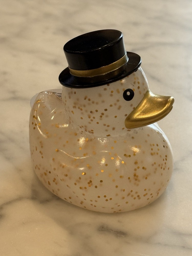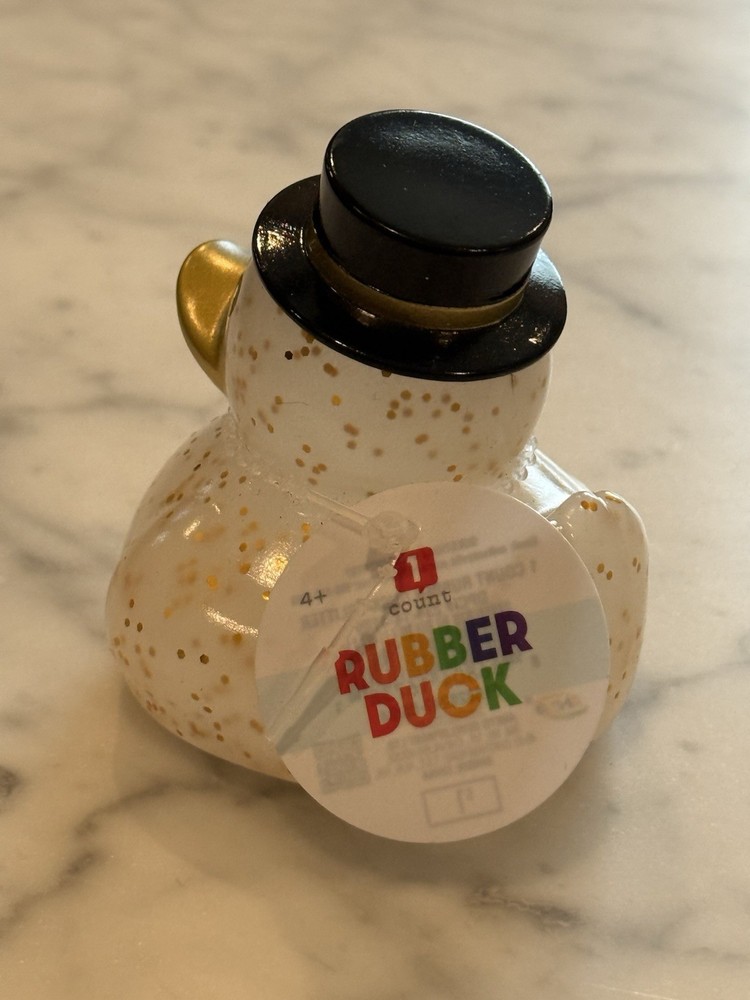 You are purchasing a 2024 Target Bullseye Playground rubber duck which is in new condition. The original price tag is affixed to its neck. This duck is a clear plastic with gold glitter flakes wearing a black top hat. Item will ship in a bubble mailer. My home is smoke free but I have a pet. I do combine shipping but ask that you email me or request an invoice from your cart when done shopping. Thanks for looking!
