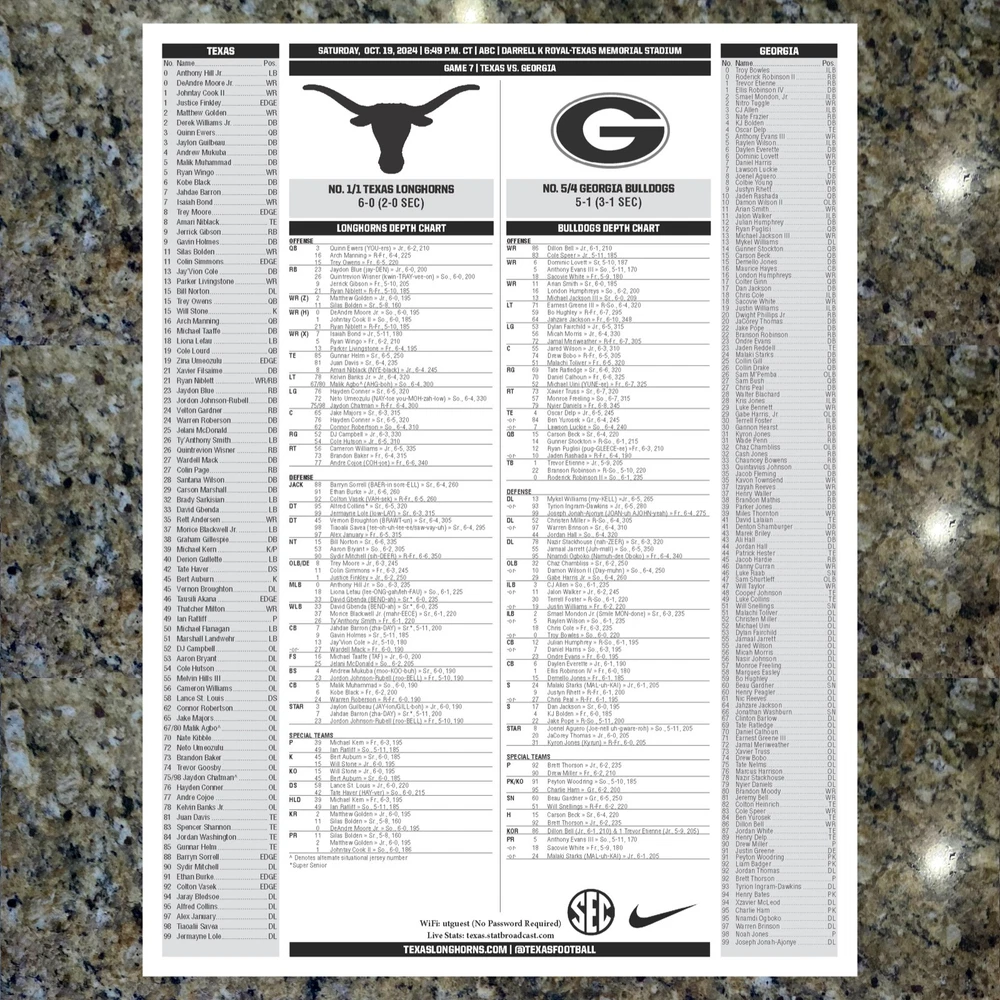 For sale, the game issued Flipcard and Media Program Notes from the SEC rivalry game Texas vs Georgia. Saturday, October 19, 2024. At Texas GAME: TEXAS VS GEORGIA DATE: SATURDAY, OCT. 19, 2024 STADIUM: DARRELL K ROYAL-TEXAS MEMORIAL STADIUM What you get: 1. 11x17 Game Issued Media Issued Flipcard - Texas vs Georgia 2. Texas Media Program Game Note (1-page) 3. Georgia Media Program Game Note (1-page) 4. Plastic protector sheet