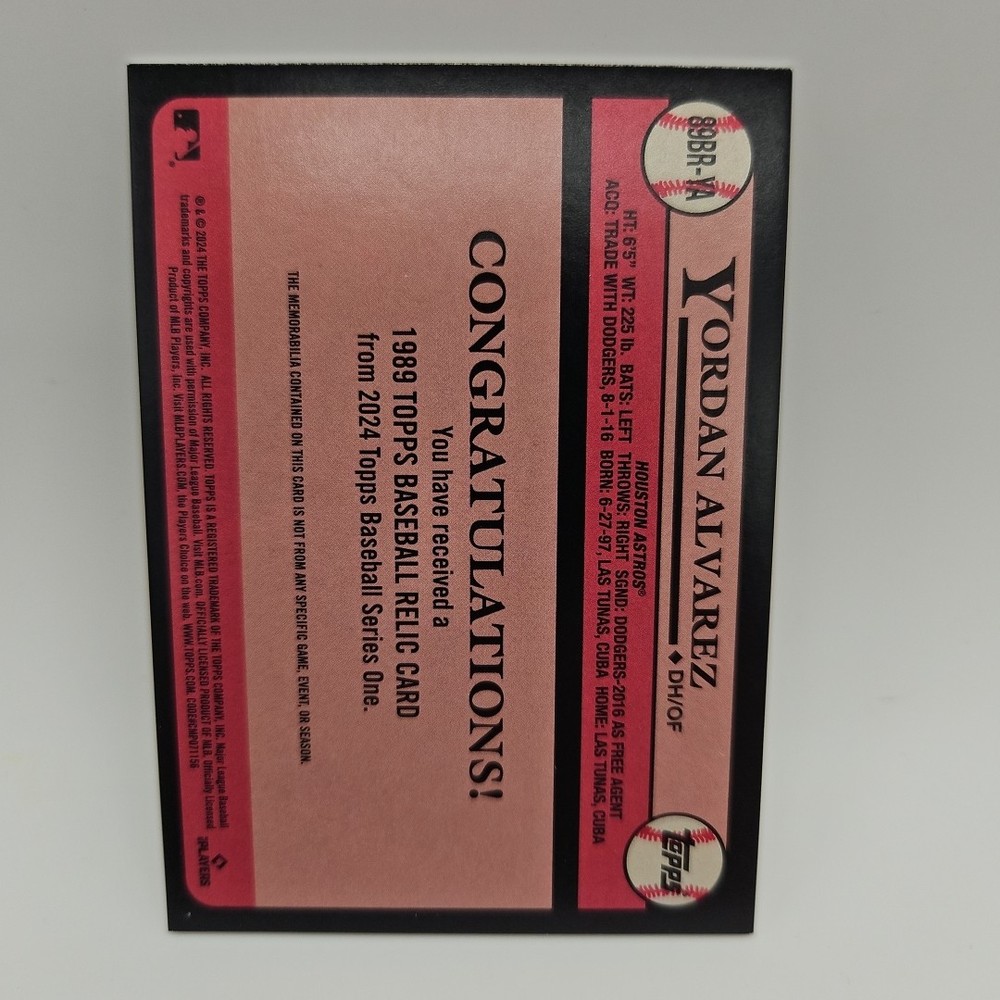 The 2024 Topps #89BR-YA Yordan Alvarez 1989 Topps Baseball Relic Card features Yordan Alvarez, a player for the Houston Astros in the Major League Baseball (MLB). This sports trading card is part of the 2024 Topps Series 2 set and belongs to the Relic parallel/variety, showcasing a piece of memorabilia from the player. The card is manufactured by Topps and includes an insert design, making it a valuable collectible for fans and collectors of baseball trading cards.
