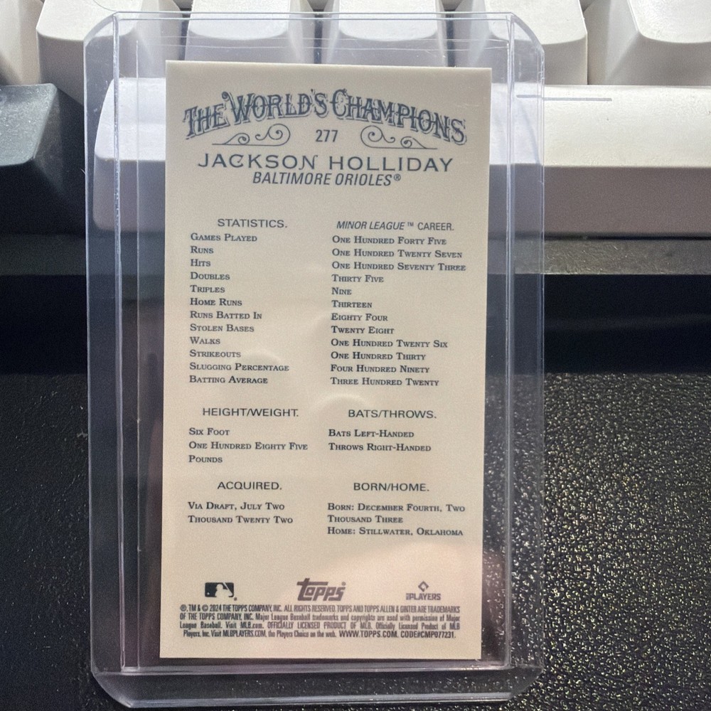 The product is a 2024 Topps Allen & Ginter Chrome Jackson Holliday #277 Mini Gold Refractor card, limited to a print run of only 50. This baseball trading card features the rookie player from the Baltimore Orioles and is part of a special insert set that includes a parallel variety and serial numbering. Manufactured by Topps, this highly sought-after card is a valuable addition to any sports trading card collection for fans of Major League Baseball.