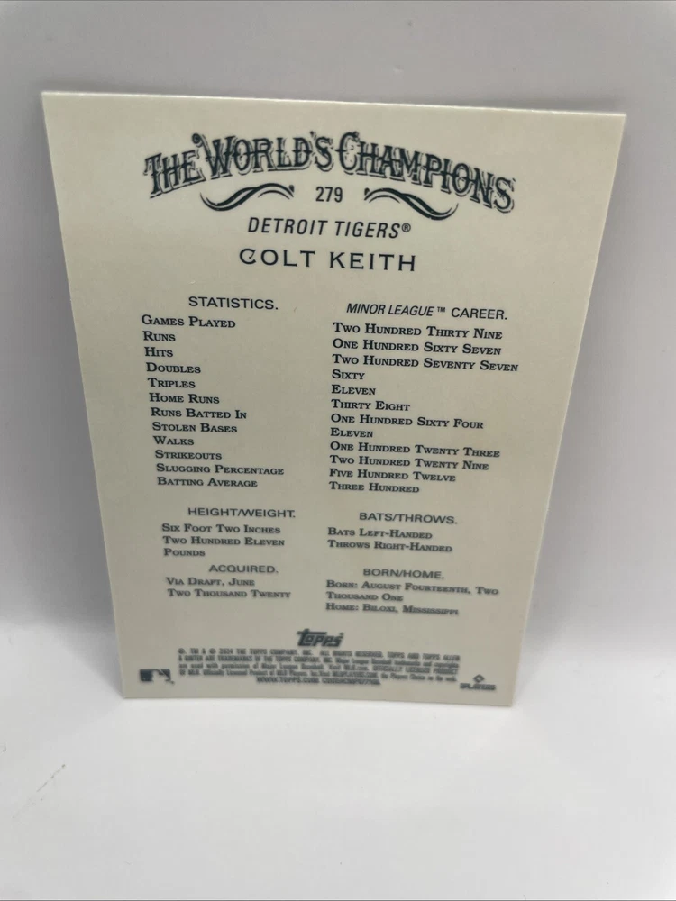 Parallel/Variety: Chrome Season: 2023 Type: Sports Trading Card Card Number: 279 Year Manufactured: 2024 League: Major League (MLB) Original/Licensed Reprint: Original Features: Insert Card Size: Standard Set: 2024 Topps Update Series Manufacturer: Topps Sport: Baseball Player/Athlete: Colt Keith Autographed: No Team: Tigers