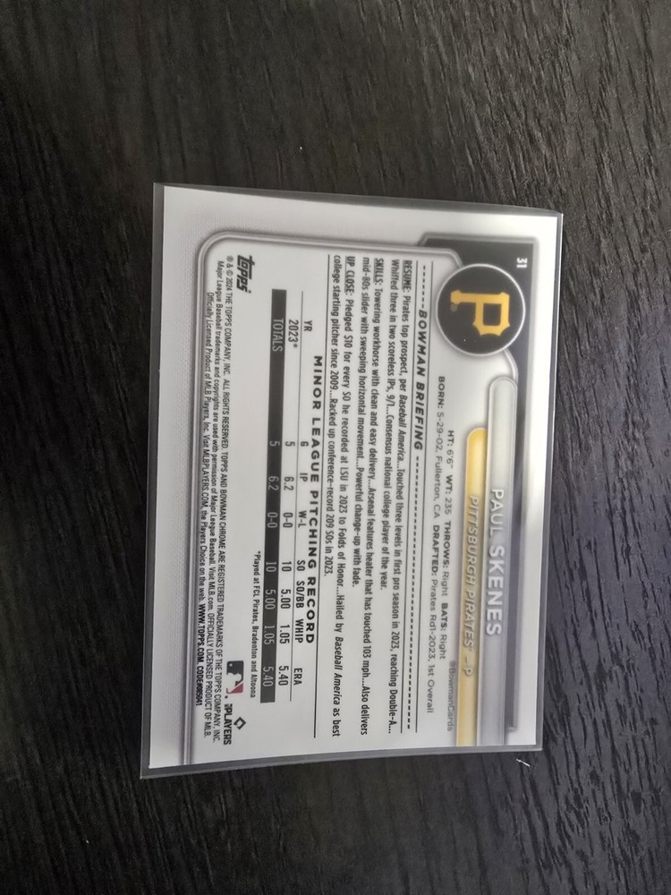 Elevate your baseball card collection with the 2024 Topps Bowman Chrome Baseball card featuring the promising talent, Paul Skenes. This card, numbered #31, is part of the Rookie Of the Year? series, capturing the essence of a burgeoning career. As a Pittsburgh Pirates representative, it's a must-have for fans and collectors alike.Crafted with the sleek Chrome parallel/variety finish, this card is a standout piece from the 2024 season. It's a non-autographed item that maintains the classic Bowman card size, perfect for displaying or trading. Celebrate the future of baseball with this commemorative piece from the respected Topps manufacturer.