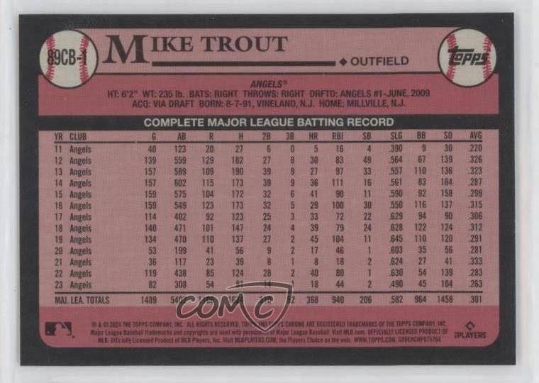 2024 Topps Chrome - 1989 Topps Baseball #89CB-1 Mike Trout - Baseball Card - Featuring the Los Angeles Angels - Featuring Mike Trout Search for more: 2024 Topps Chrome Search for more: 2024 Topps Chrome - 1989 Topps Baseball View all of our Listings Auctions Buy It Now About Us Located in the beautiful Pacific Northwest, COMC (Check Out My Cards) is the world's largest consignment service for trading card singles. More than 10,000 people have used our consignment service to list over 50 million trading cards. We currently house 20 million cards, each listed for sale with front and back images of the actual card. Find out how we can help you consign your items on eBay by contacting us through eBay messaging. COMC -- "The Safe & Easy Way to Buy & Sell" Representative Image - Select Specific Item above to see image of actual item Representative Image - Select Specific Item above to see image of actual item Raw Condition for Modern Cards Unless otherwise noted, raw modern cards are listed in Near Mint-Mint condition or better. A NM-MT card appears to be Mint at first glance, but upon closer inspection, may exhibit some of the following: minor print defects (e.g. roller marks, print line, dimple), minor scratches, slight edge wear, and slight corner wear. Centering is clearly visible in the images provided and does not factor into our condition assessment. Raw Condition for Vintage Cards Unless otherwise noted, raw vintage cards are listed in Excellent condition or better. An EX card may exhibit some of the following: minor rounding of corners, surface wear, print defects, light scratches, and slight edge wear/chipping. Centering is clearly visible in the images provided and does not factor into our condition assessment. Domestic Shipping Combined shipping for multiple items is available. To receive combined shipping, please ensure all desired items are in your eBay shopping cart before proceeding to checkout. eBay limits orders to 40 items per order. We automatically combine multiple orders placed on the same day. If you place multiple orders on the same day, please contact us to request a refund of applicable shipping costs. Signature confirmation may be required on invoices over $400. Raw cards are shipped in toploaders. International Shipping COMC offers eBay's International Shipping (EIS) for international orders under $2,500* (see country exceptions below). All duties and import fees are paid at checkout; in the rare event that there are additional import fees upon delivery, these are borne by the buyer. EIS packages route through a shipping hub in Erlanger, KY before shipping to their final destination. Please note that EIS does not allow for combined shipments. The shipping rates are determined by eBay and cannot be adjusted. *Maximum sale price exceptions: Colombia, Kuwait ($2,000); Taiwan ($1,539); Chile, Costa Rica, Guatemala, Honduras, Trinidad and Tobago ($1,000); Antigua and Barbuda, Aruba, Belize, Dominica, Grenada, Philippines, Saint Kitts and Nevis, Saint Lucia, Montserrat, Turks and Caicos Islands ($500); Dominican Republic, El Salvador ($200). Please request a shipping quote through eBay messaging for orders that exceed the maximum sale price supported by eBay's International Shipping. You will be responsible for all duties and import fees for international orders shipped outside the EIS. Raw cards are shipped in toploaders. Payment COMC does not accept offers on our cards through our eBay storefront. COMC utilizes eBay’s managed payments system. If you are experiencing difficulties making a payment, please contact eBay for assistance. Return Policy Returns are only accepted on the rare occasion the item is not as described. If you are making a return, please initiate the return process through eBay so a mailing label can be provided for you. Prior to listing, our expert team carefully assessed this item to represent it accurately. Please review the description and high-definition images prior to purchasing to ensure this item meets your satisfaction. We welcome you to contact us if you have further questions about this item. Trust and Integrity COMC carefully assesses each item consigned to us to prevent fraudulent items from entering the marketplace. If you believe an item offered on COMC may be fraudulent, please contact us with details so we can investigate the issue. Items we determine are outside our supported items policy may be removed. Last Modified: 12/23/2024 12:36:37 PM PDT