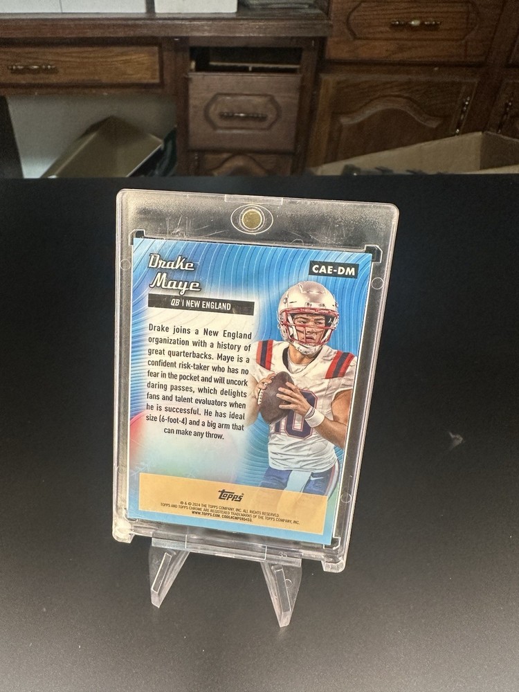 The 2024 Topps Chrome All-Etch Drake Maye #CAE-DM Pink Refractor trading card is a rookie insert featuring the talented football player from the New England Patriots. This limited edition card is part of the Topps Chrome set for the 2024 season, making it a highly sought-after collectible for NFL fans and trading card enthusiasts alike. With its unique pink refractor design and exclusive All-Etch insert set, this card captures the essence of the sport and the rising star of the league.
