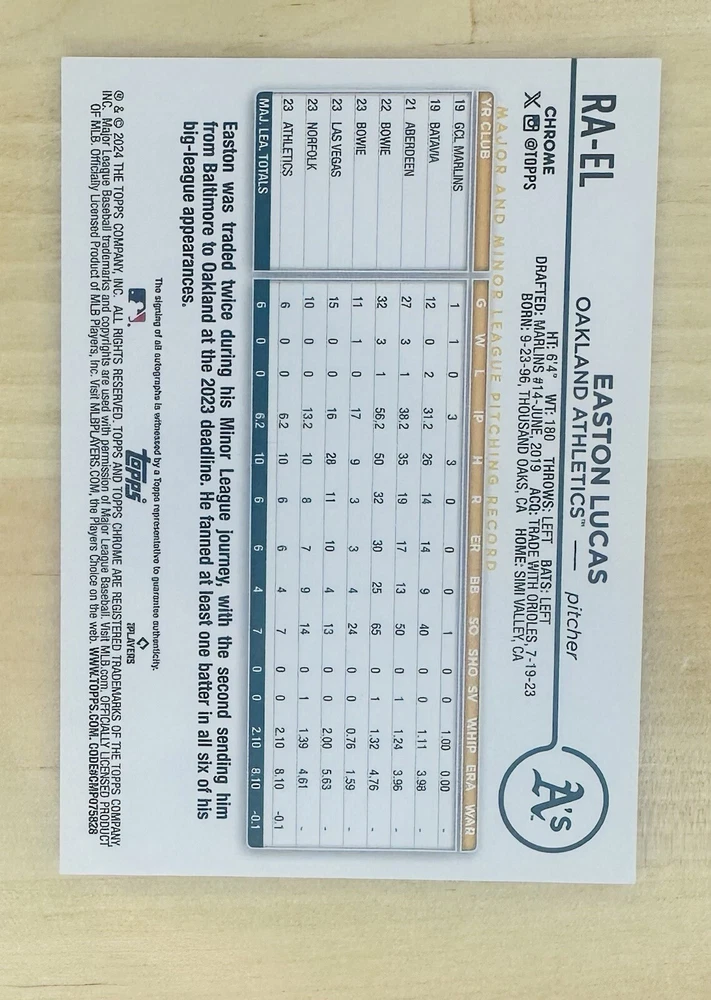 This 2024 Topps Chrome sports trading card features Easton Lucas, a rookie from the Oakland Athletics in Major League Baseball. The card is autographed and made of chrome material, with a shiny finish that adds to its overall appeal. It is a single card from the 2024 Topps Chrome set, and is in excellent shape, near mint or better. The card is perfect for collectors who appreciate baseball memorabilia, especially those who are fans of the Oakland Athletics. It is a great addition to any sports trading card collection, and its autographed feature makes it even more special. Don't miss out on the chance to own this rare and highly sought-after card.