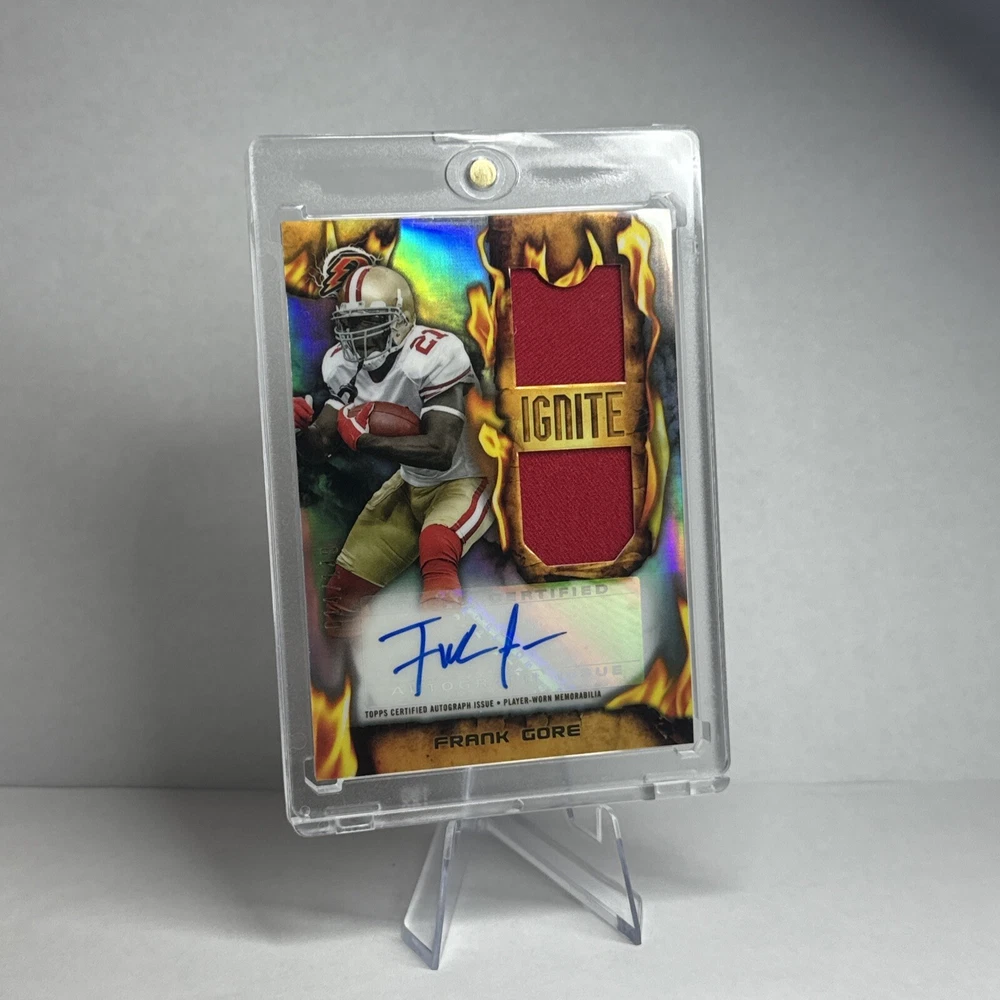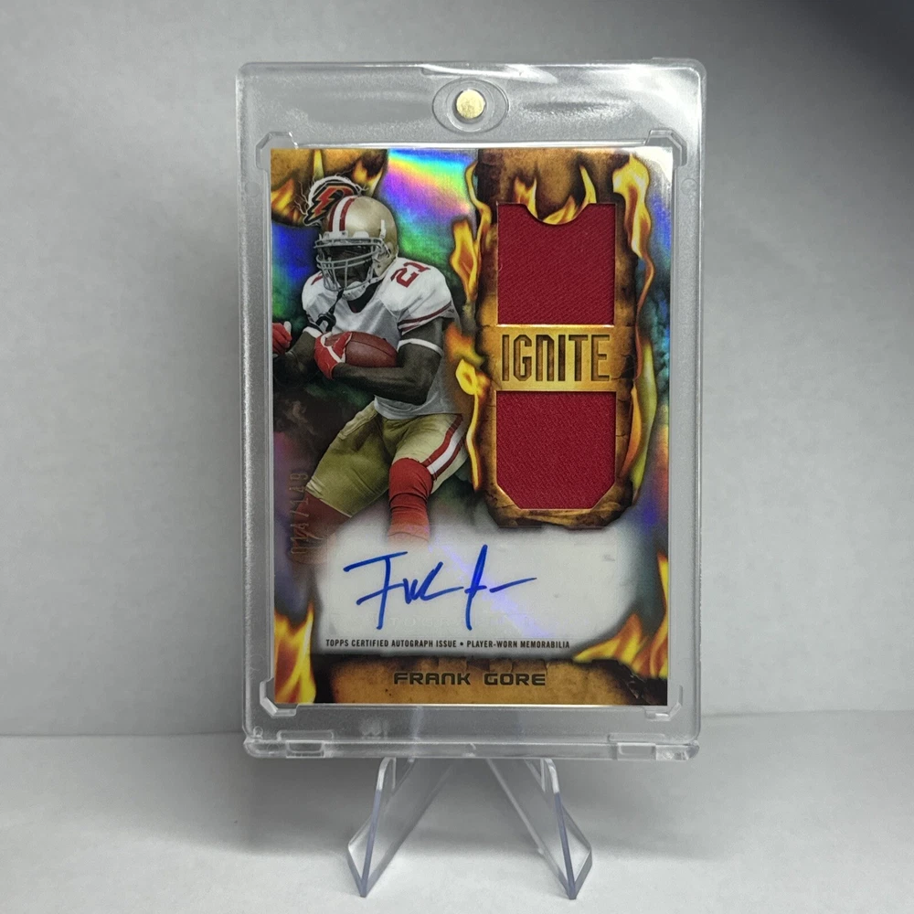 This 2024 Topps Chrome Football card features an autographed patch of Frank Gore, a former player of the San Francisco 49ers. The card is part of the Ignite collection and is serial numbered out of 149. It is a near mint or better card and has not been graded. The card is a sports trading card with a parallel/variety of patch and features an insert. It is manufactured by Topps and has the card number RIRPA-FG. The card is from the 2024 season of the National Football League (NFL) and is a must-have for collectors who are fans of Frank Gore or the San Francisco 49ers.