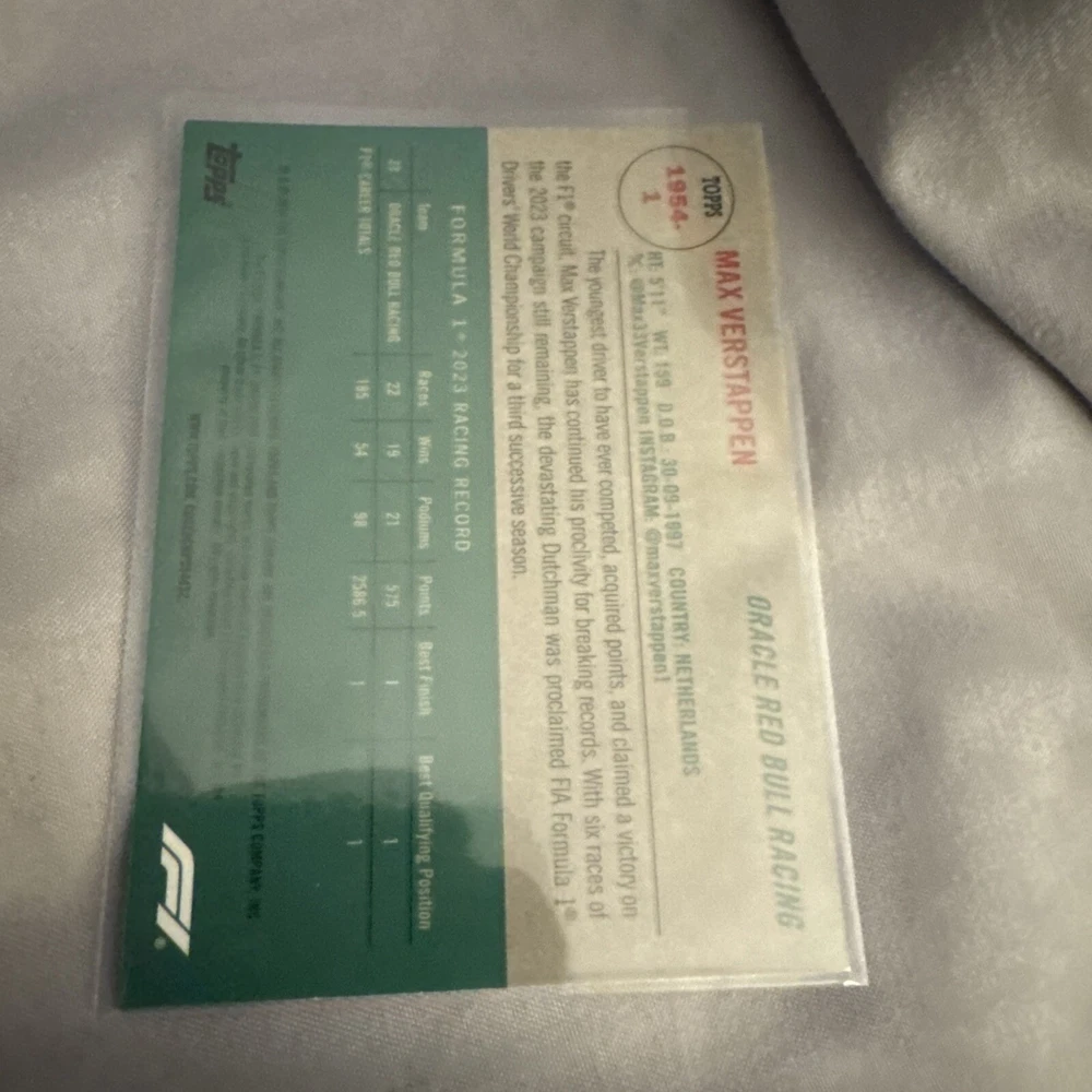 Capture the thrill of Formula 1 with the 2024 Topps Chrome Max Verstappen card, featuring the star driver of the Oracle Red Bull Racing team. This card, numbered 1954-1, showcases Verstappen in action and is a must-have for enthusiasts of auto racing memorabilia. With its lustrous Red Parallel/Variety finish, it's a standout piece that reflects the speed and excellence of both the athlete and the sport. As part of the esteemed 2024 Topps Chrome set, this trading card is produced in the United States and presents the finest quality card stock. It's an original print, ensuring authenticity, and is designed in English for accessibility. Whether you're expanding your collection or gifting a Formula 1 fan, this card is a celebration of the racing season and a tribute to one of the sport's most dynamic drivers.