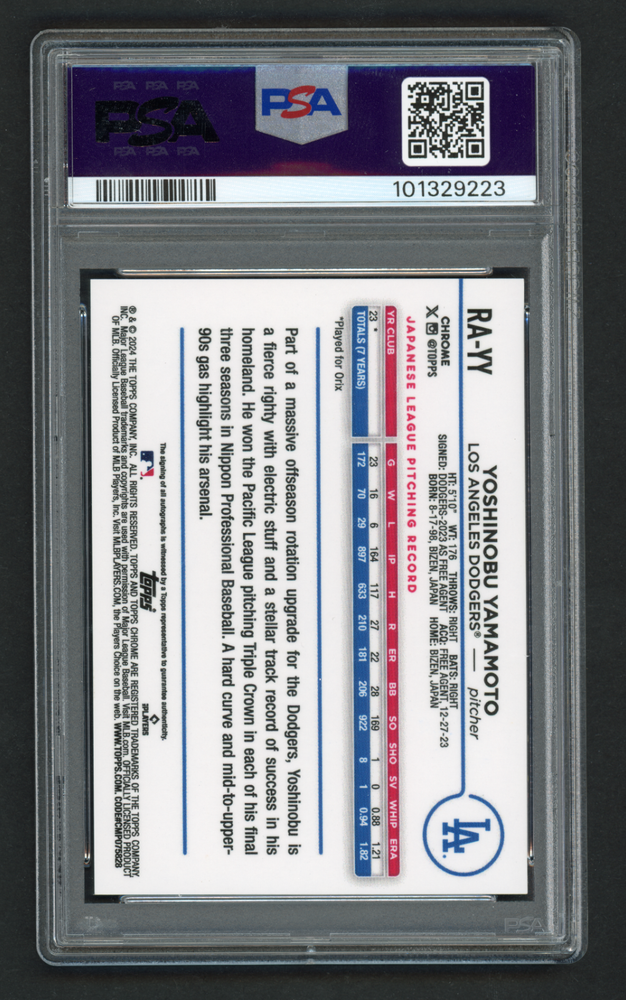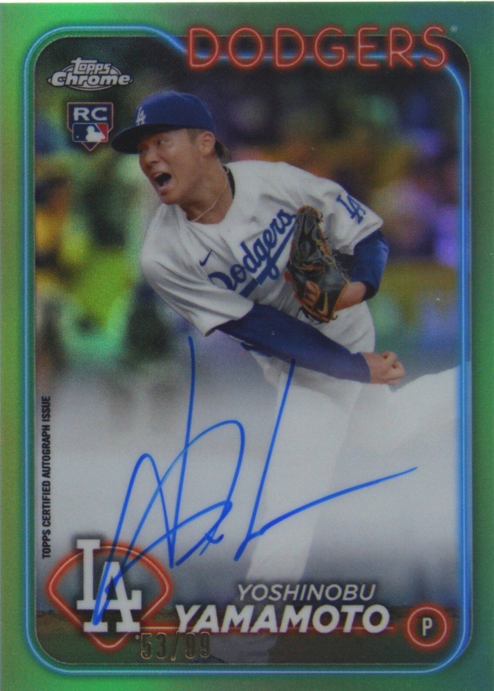 The product is a 2024 Topps Chrome Yoshinobu Yamamoto 35th Anniversary Rookie Auto trading card, numbered 49/99. This card features a hard-signed autograph by Yamamoto, a player from the Los Angeles Dodgers. The card is part of the MLB World Series event and is manufactured by Topps. It is a standard-sized card made of 35 Pt. card stock and is an original release in English language. This highly collectible sports trading card is not graded and is authenticated by Topps.