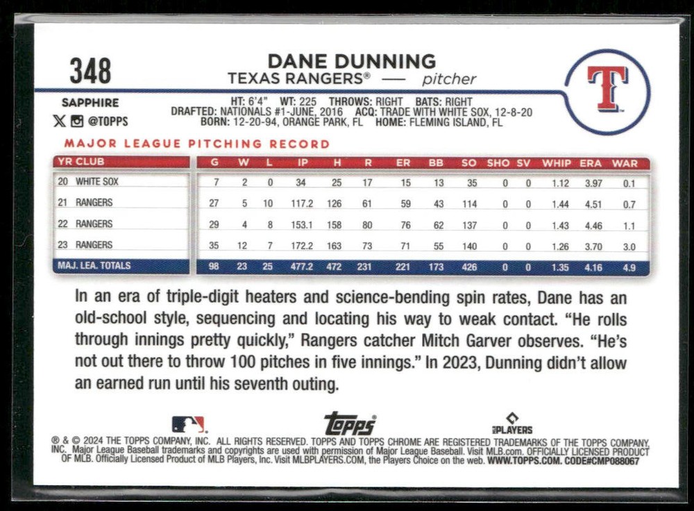 ⚾ Baseball Card featuring 2024 Topps Chrome Sapphire Edition #348 Dane Dunning - Texas Rangers . ⚾ 🔥 Product Details: Set: 2024 Topps Chrome Sapphire Edition Player: Dane Dunning Card Number: #348 Team: Texas Rangers 🌟 Key Features: Authentic baseball base card from the 2024 Topps Chrome Sapphire Edition series. Dynamic image capturing Dane Dunning in action for Texas Rangers. Essential for any baseball card collection. 💡 Why You'll Love It: Celebrate your favorite player and team. A foundational piece for baseball card enthusiasts. Quality craftsmanship and officially licensed. 👉 Explore my other Buy Now listings for more baseball base cards and collectibles! Please note that this advertisement is tailored for platforms such as eBay and is aimed at showcasing the key aspects of the sports card. The images included are of the actual card in question. We encourage you to closely examine these images for a detailed overview, including any blemishes or imperfections on the card. Your careful inspection will ensure a thorough understanding of the card's condition.
