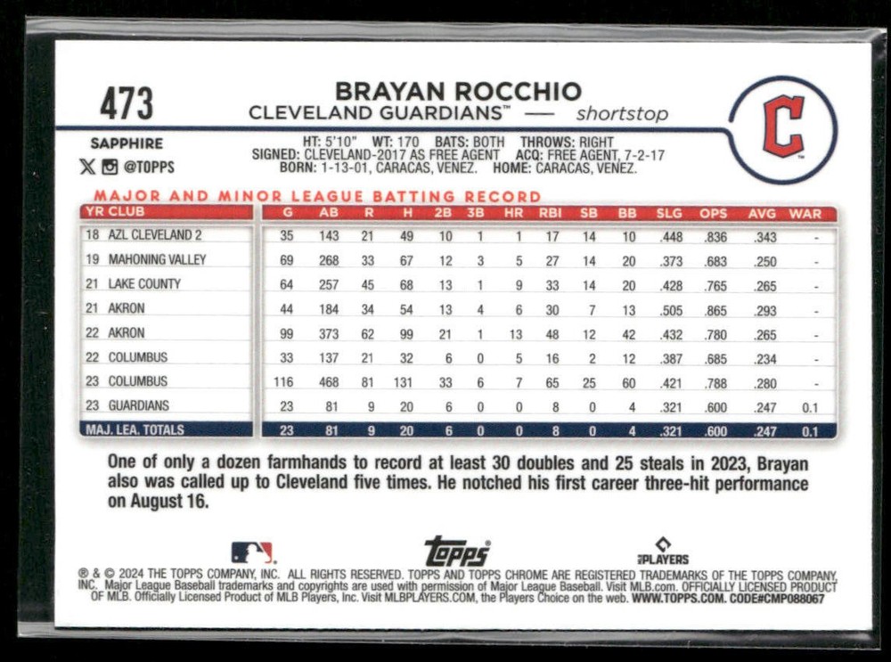 ⚾ Baseball Card featuring 2024 Topps Chrome Sapphire Edition #473 Brayan Rocchio - Cleveland Guardians . ⚾ 🔥 Product Details: Set: 2024 Topps Chrome Sapphire Edition Player: Brayan Rocchio Card Number: #473 Team: Cleveland Guardians 🌟 Key Features: Authentic baseball base card from the 2024 Topps Chrome Sapphire Edition series. Dynamic image capturing Brayan Rocchio in action for Cleveland Guardians. Essential for any baseball card collection. 💡 Why You'll Love It: Celebrate your favorite player and team. A foundational piece for baseball card enthusiasts. Quality craftsmanship and officially licensed. 👉 Explore my other Buy Now listings for more baseball base cards and collectibles! Please note that this advertisement is tailored for platforms such as eBay and is aimed at showcasing the key aspects of the sports card. The images included are of the actual card in question. We encourage you to closely examine these images for a detailed overview, including any blemishes or imperfections on the card. Your careful inspection will ensure a thorough understanding of the card's condition.