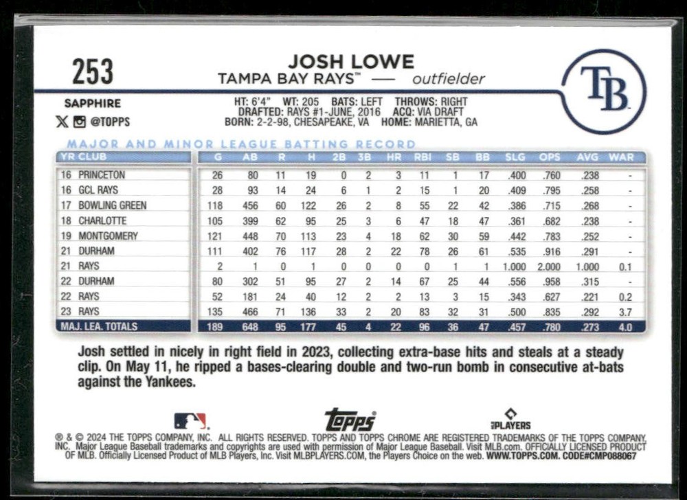 ⚾ Baseball Card featuring 2024 Topps Chrome Sapphire Edition #253 Josh Lowe - Tampa Bay Rays . ⚾ 🔥 Product Details: Set: 2024 Topps Chrome Sapphire Edition Player: Josh Lowe Card Number: #253 Team: Tampa Bay Rays 🌟 Key Features: Authentic baseball base card from the 2024 Topps Chrome Sapphire Edition series. Dynamic image capturing Josh Lowe in action for Tampa Bay Rays. Essential for any baseball card collection. 💡 Why You'll Love It: Celebrate your favorite player and team. A foundational piece for baseball card enthusiasts. Quality craftsmanship and officially licensed. 👉 Explore my other Buy Now listings for more baseball base cards and collectibles! Please note that this advertisement is tailored for platforms such as eBay and is aimed at showcasing the key aspects of the sports card. The images included are of the actual card in question. We encourage you to closely examine these images for a detailed overview, including any blemishes or imperfections on the card. Your careful inspection will ensure a thorough understanding of the card's condition.