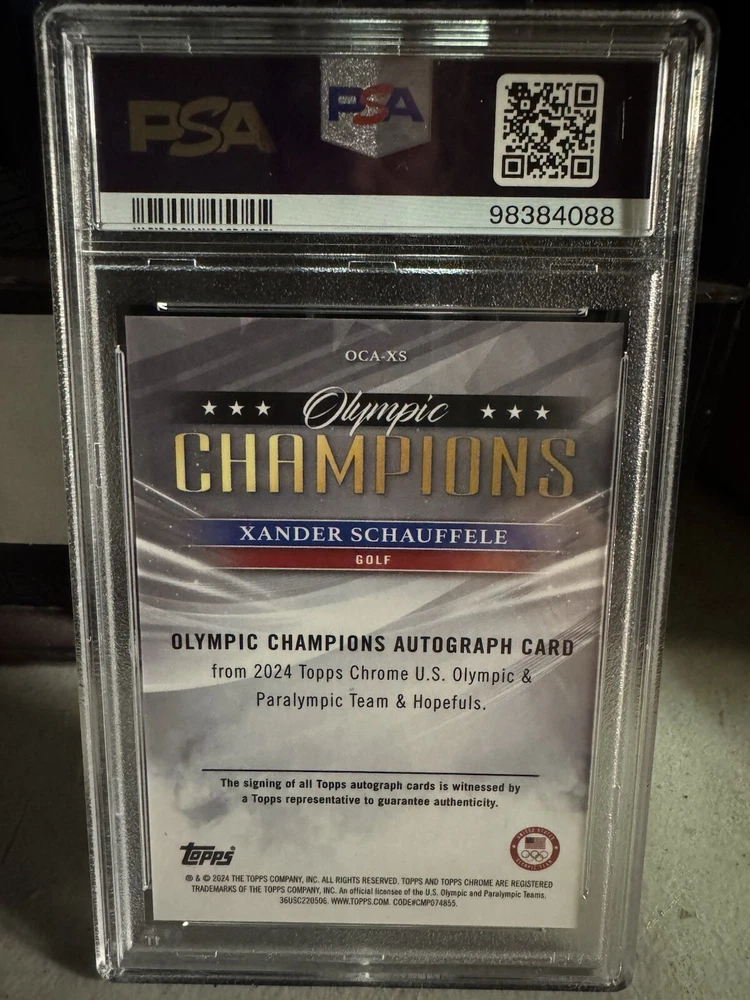 Capture a piece of sports history with this 2024 Topps Chrome US Olympic Xander Schauffele Flag Auto RC, card number OCA-XS. This collectible features the renowned golfer Xander Schauffele and is part of the prestigious 2024 Topps Chrome set. As a standout item, it boasts a hard-signed autograph by Schauffele himself, authenticated by Topps for unquestionable legitimacy. This rookie card is not just a single, it's a gem from the PGA Tour, celebrating the Olympic Games season. With a limited print run of just 76, this card is numbered 61 and has been professionally graded by PSA with a perfect score of 10. It's a chromium-finished treasure, a must-have for golf enthusiasts and serious collectors alike.