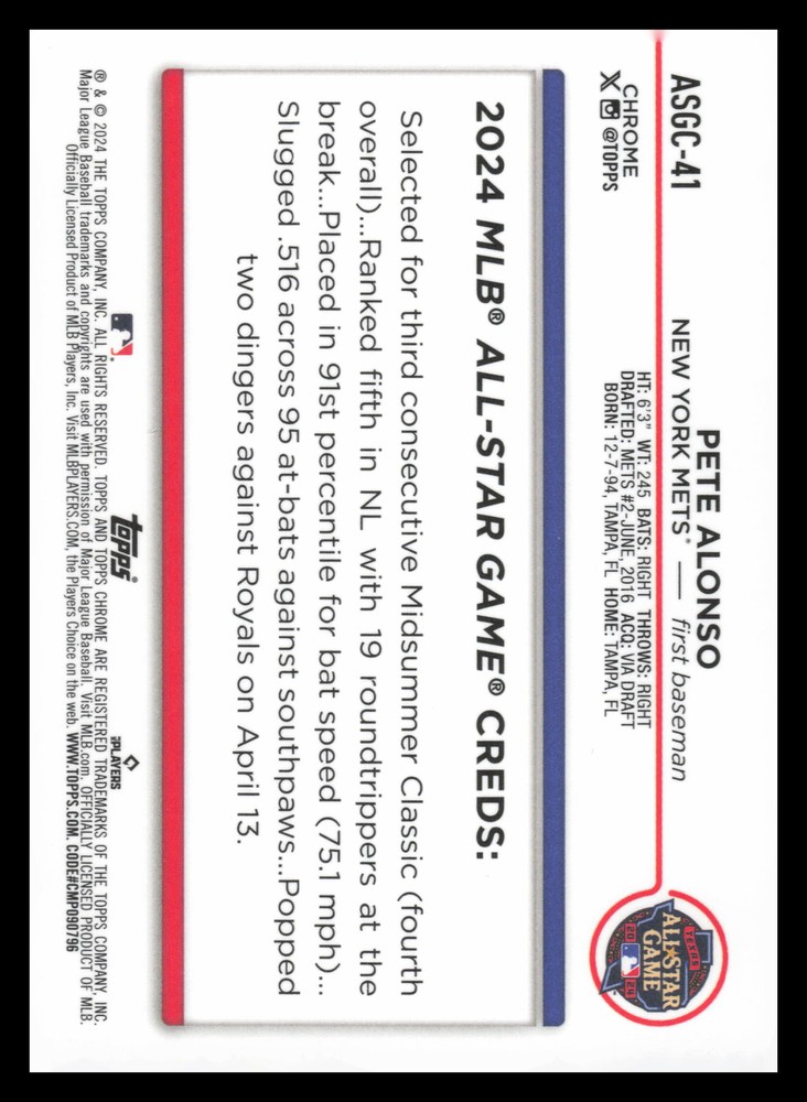 2024 Topps Chrome Update Pete Alonso Cards typically ship each morning around 5 am. I offer the following shipping services: ebay standard envelope: this is put in a semi rigid card holder with a piece of blue painters tape sealing it and in a plain white envelope with tracking. This is typically for cheaper cards ($20 or less). This service may not be available for thicker cards. USPS First Class: this is put in a top loader, then into a team bag with a piece of card board in it as well. Then shipped in a bubble mailer with tracking. This is for individuals that do not like the idea of the plain white envelope or for cards $20-100. USPS Priority Small Flat Rate Box: this is put into a top loader, then into a priority bubble mailer, then lastly into a flat rate priority box with tracking. Ideally for cards priced over $100. Please check my store as I combine shipping.