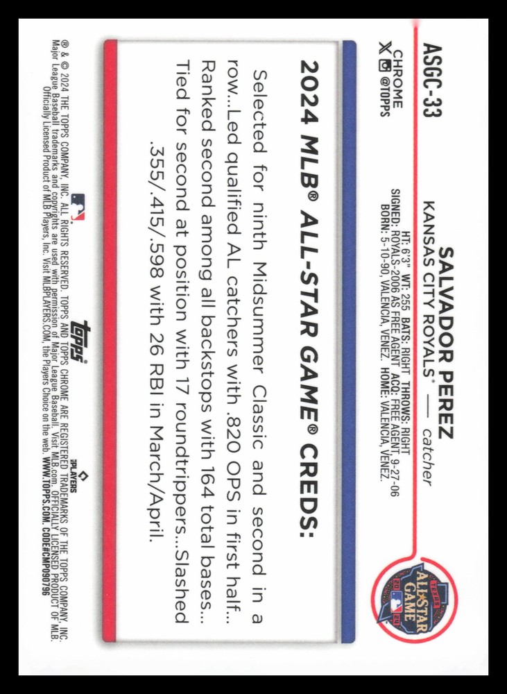 2024 Topps Chrome Update Salvador Perez Cards typically ship each morning around 5 am. I offer the following shipping services: ebay standard envelope: this is put in a semi rigid card holder with a piece of blue painters tape sealing it and in a plain white envelope with tracking. This is typically for cheaper cards ($20 or less). This service may not be available for thicker cards. USPS First Class: this is put in a top loader, then into a team bag with a piece of card board in it as well. Then shipped in a bubble mailer with tracking. This is for individuals that do not like the idea of the plain white envelope or for cards $20-100. USPS Priority Small Flat Rate Box: this is put into a top loader, then into a priority bubble mailer, then lastly into a flat rate priority box with tracking. Ideally for cards priced over $100. Please check my store as I combine shipping.