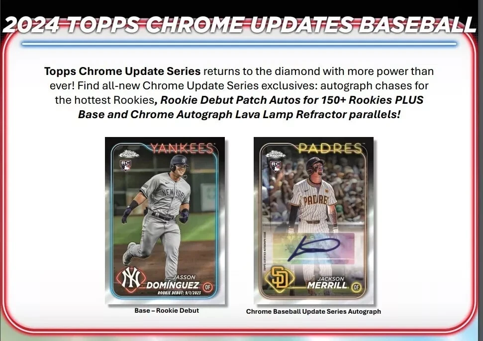 One mega box of Topps Chrome Update Series baseball cards. This factory-sealed box includes 7 packs containing 4 cards each, for a total of 28 cards. Each box is guaranteed to include 10 X-Refractor parallels, 1 prism refractor parallel, and 2 Raywave parallels. In addition, f ind all-new Chrome Update Series exclusives including: autographed rookie cards, Rookie Debut Patch Autos for 150+ Rookies plus Base and Chrome Autograph Lava Lamp Refractor parallels! This is your chance to chase the coveted 1/1 Paul Skenes Rookie Debut Patch Auto - which the Pittsburgh Pirates has offered a slew of rewards for, including 2 season tickets for 30 seasons!