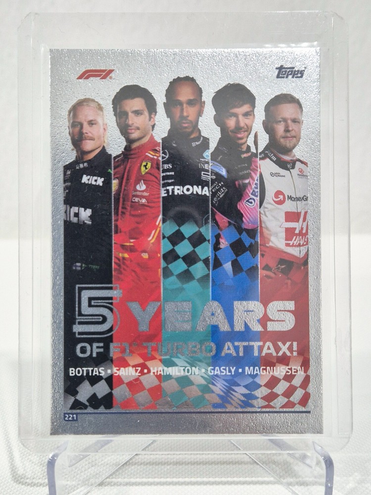 The 2024 Topps F1 Turbo Attax 5 Years Of Anniversary F1 #221 Formula 1 - UK Edition is a sports trading card featuring Formula 1 drivers such as Carlos Sainz, Valteri Bottas, and Lewis Hamilton. Manufactured by Topps in the United Kingdom, this card is part of the 2024 Topps set and is made of card stock with a foil parallel variety. It is a serial numbered card with a chase feature, celebrating 5 years of the Turbo Attax series in the world of Formula 1.