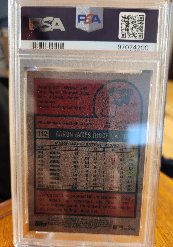 This 2024 Topps Heritage sports trading card features Major League Baseball (MLB) player Aaron Judge, card number 112, and a grade of 10 from Professional Sports Authenticator (PSA). The card is part of the Topps Heritage series and is a base set card. It's perfect for any baseball fan or collector looking to add a graded card of Aaron Judge to their collection. The card is manufactured by Topps and is a great addition to any sports trading card collection. Get your hands on this highly sought-after card today!