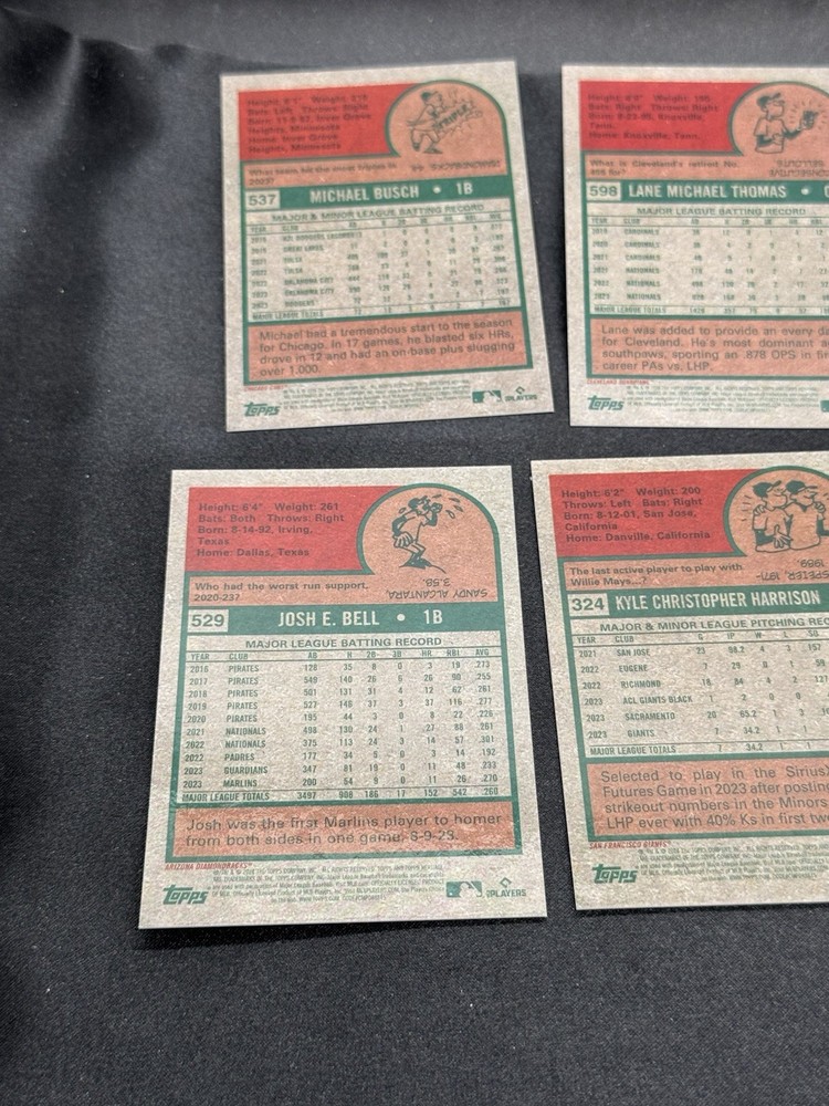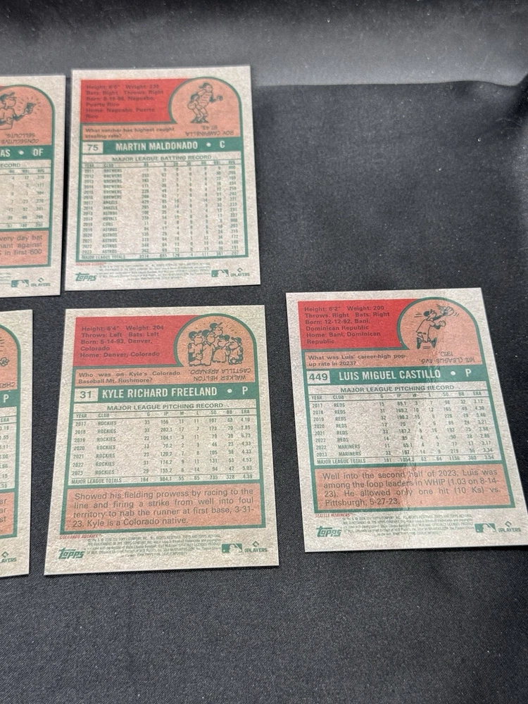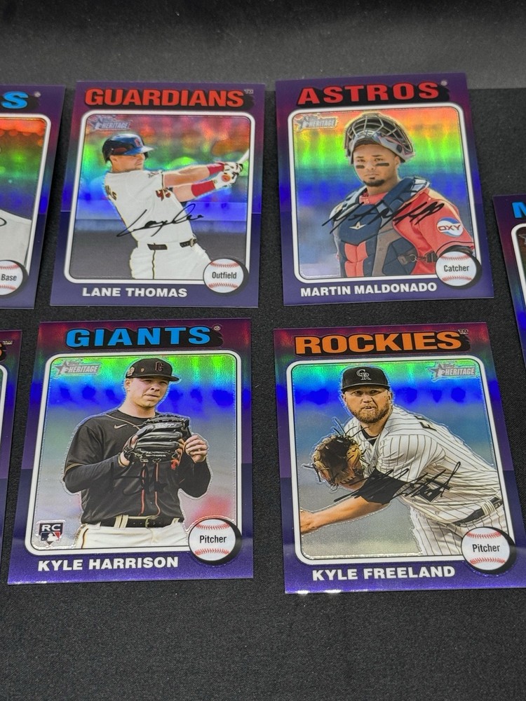 2024 Topps Heritage High Number Purple Chrome Refractor Lot of 7 cards - no duplicates!! You are bidding on the following seven card lot: 31 - Kyle Freeland 75 - Martin Maldonado 324 - Kyle Harrison - RC 449 - Luis Castillo 529 - Josh Bell 537 - Michael Busch 598 - Lane Thomas Thanks for checking out our listings. Please reach out to us if you should have any questions about any of our listings and be sure to check out our other items listed on eBay if you are looking for singles, inserts, lots, etc. from this set or any others - We have plenty of extras of base cards, as well as inserts!! Also, feel free to message us with any questions you might have regarding the photos. Most of our cards were opened from packs and went directly into soft “penny” sleeve and into a hard card (handled with care). Shipping We do offer combined shipping for anyone who purchases more than one item from us. Simply message us when you are finished shopping, and we will send a combined invoice with discounted shipping on it. All cards will be carefully placed inside a soft “penny” sleeve, hard card, team bag, and then between two pieces of cardboard and secured inside a bubbled envelope (unless you pay for eBay Standard envelope). If the items do not fit inside a bubbled envelope, then we will put cards in a plastic case, and ship the items inside a small box using air bags, packing peanuts, bubble wrap, etc. and make sure the item(s) are carefully packaged and secured. If you prefer to save on shipping, we do offer the “eBay standard envelope” shipping rate of $1.15 for cards/items that weigh less than three ounces, and the card(s) price is less than $20 for the card. Be sure to choose the preferred shipping method when you checkout, as we do offer a couple of options for you. If you purchase a complete set, then we will carefully package your item(s) using bubble wrap, air bags, and/or packing peanuts to make sure your item arrives safely. Be sure to check out our feedback messages and see what other buyers are saying about us. All items will carefully ship within 24 hours of receiving confirmed payment. Thanks for checking out our items and we look forward to doing business with you!!