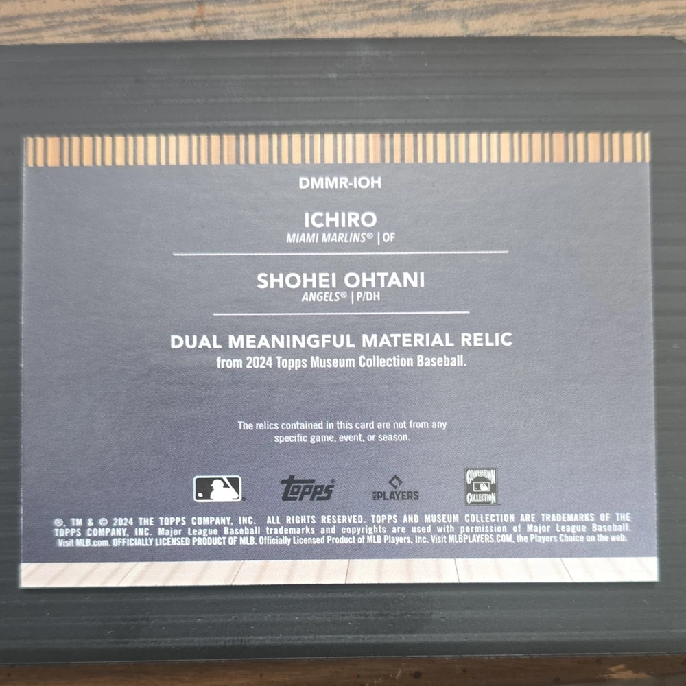 The 2024 Topps Museum Ichiro Ohtani Dual Relic DMMR-IOH trading card is a limited edition collectible featuring meaningful material relics from the Major League Baseball (MLB) players Ichiro Suzuki and Shohei Ohtani. This dual relic card is part of the 2024 Topps Museum Collection set and is serial numbered 50/ 50, making it a rare and coveted item for fans and collectors. The card showcases memorabilia from both players, representing the Miami Marlins and Los Angeles Angels teams respectively, and is a valuable addition to any baseball card collection.