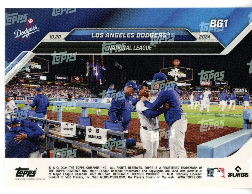 Up for sale is the 2024 Topps Now #861 card featuring the Los Angeles Dodgers’ historic offensive performance, setting an NLCS record with 46 runs scored to secure a spot in the World Series. This limited print run card captures a remarkable achievement in Dodgers history. Card Details: Team: Los Angeles Dodgers Set: 2024 Topps Now Card Title: "Clinch World Series Berth Behind NLCS Record 46 Runs Scored" Card Number: #861 Print Run: 4,177 Description: Commemorate the Dodgers' outstanding NLCS performance with this special-edition card, highlighting their record-breaking 46 runs scored. With a limited print run of 4,177, it’s a must-have for Dodgers fans and collectors alike. Don't miss the chance to add this unique collectible to your collection! Thank you for looking.