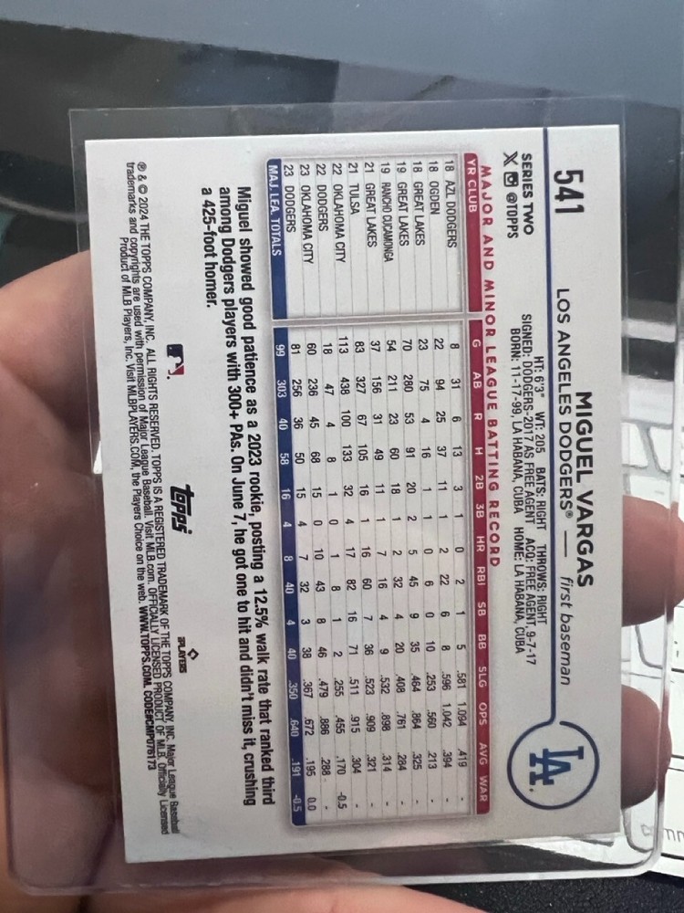 Parallel/Variety:Black FoilSet:2024 Topps Series 2Manufacturer:ToppsCard Number:541League:Major League (MLB)Season:2024Team:Los Angeles DodgersType:Sports Trading CardAutographed:NoPlayer/Athlete:Miguel VargasSport:Baseball