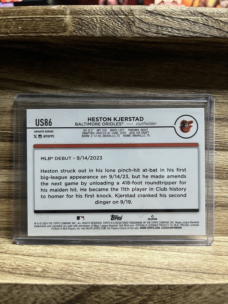 Sport:BaseballPlayer/Athlete:Heston KjerstadParallel/Variety:[Base]Card Number:394Season:2024Team:Baltimore OriolesYear Manufactured:2024Manufacturer:ToppsCard Thickness:20 Pt.League:Major League Baseball (MLB)Material:Card StockSet:2024 Topps Series 2Event/Tournament:MLB World SeriesOriginal/Licensed Reprint:OriginalVintage:NoType:Sports Trading CardFeatures:Rookie, Base SetAutographed:NoCountry/Region of Manufacture:United States