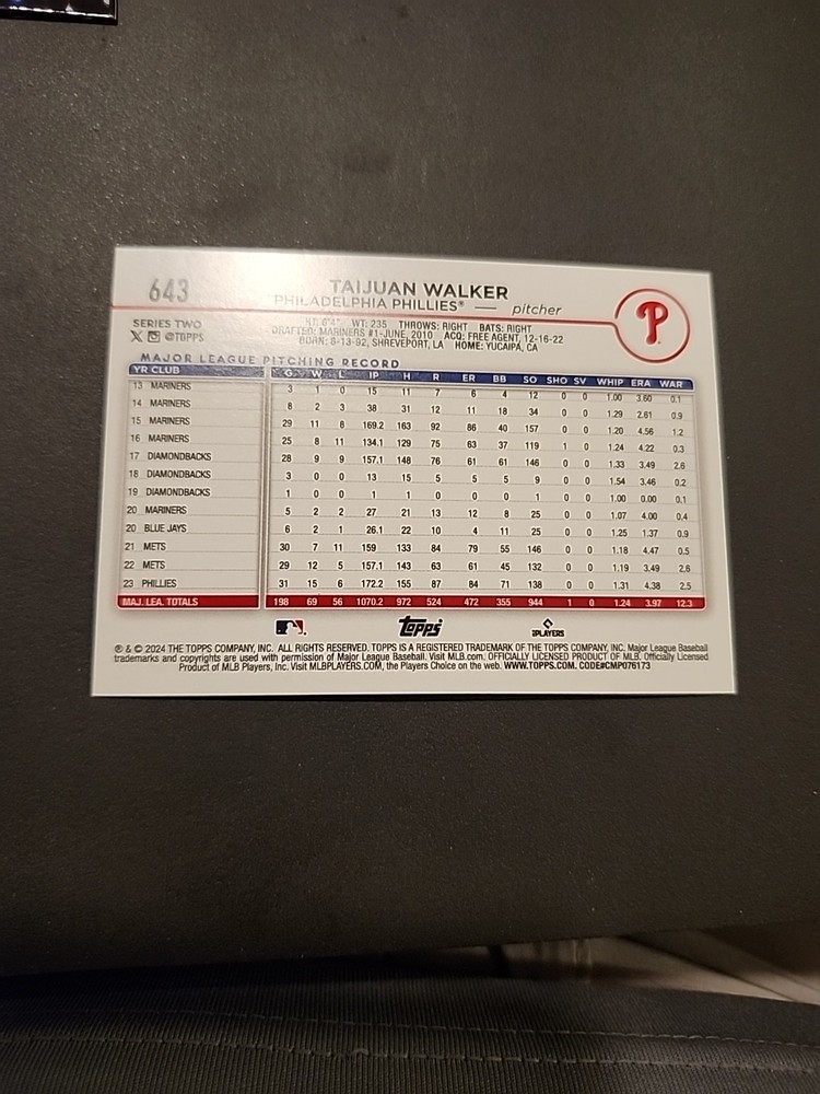 The product is a 2024 Topps Series 2 trading card featuring Taijuan Walker of the Philadelphia Phillies. This particular card is a black foil parallel variety, which adds a unique and collectible element to the standard base card. The card is in excellent condition, making it an appealing choice for collectors looking to add a special piece to their sports trading card collection.