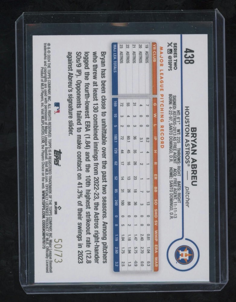 This is a nice example of a 2024 Topps #438 Bryan Abreu Black Other important information about this card: SN In 2024 Bryan Abreu played for the Houston Astros. Please check out our other listings for more great cards.