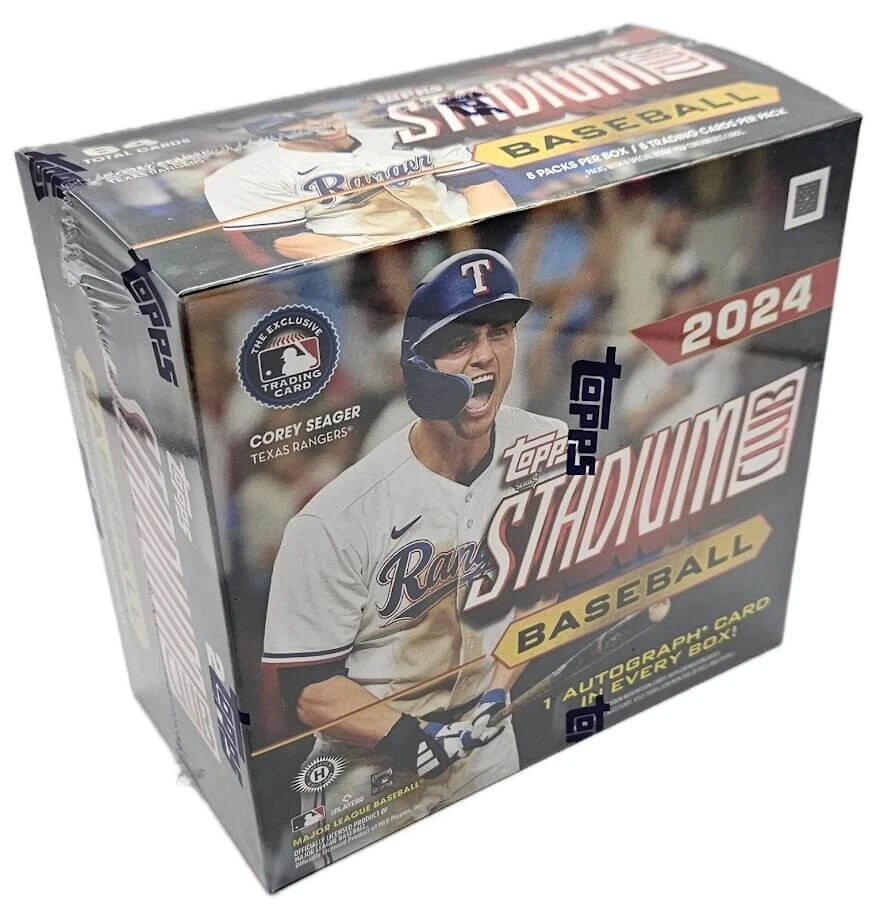 2024 Topps Stadium Club Baseball - Sealed Compact Hobby Box 8 Packs Per Box - 8 Cards Per Pack 1 Autograph Per Box Stadium Club features the most eye appealing imagery in trading cards. Look for on-card autographs, exciting inserts, Chrome cards, variations, short prints and more! Find a variety of players including rookies, veterans and top legends from year’s past. 1 Autograph 1 Base Card Chrome Variation Refractor Parallels 1 Base Card Chrome Variation Parallel Or Triumvirates Insert Card Or Parallel Find the most iconic imagery paired with a full bleed design. Look for Image and Design Variations in limited quantities. 2024 features more Chrome Variations than ever before, look for the entire base set to be offered with a wide range of parallels. Base Chrome Green Refractor Parallel NEW! Base Chrome Green Refractor Parallel NEW! Power Packed Insert Printed on Holographic filmboard and throws it back to 1996 baseball for the design inspiration. Look for a mixture of rookies, veterans and legends including 4 parallels! NEW! Special Forces Insert Printed on Holographic filmboard and features pitchers/hitters from yesterday and today. Look for 4 parallels including the Gold Rainbow 1/1! – NEW! Triumvirates Nickname A new Chrome insert that features the players nickname spelled out across three cards. NEW! AUTOGRAPHED CARDS Stadium Club features an array of autograph designs including the iconic Base Autographs and Chrome Base Autographs. Also look for limited autographs including CFPro Autographs, Goin’ Yard Autographs, Lone Star Autographs, Base Variation autographs and more! Base Card Autographs Features similar photography as the base set paired with on-card autographs! Look for 5 parallels numbered from 50 down to 1/1’s. Chrome Base Autographs Picks up the imagery from the Base Card Autographs and adds a Chrome finish! Look for 3 parallels numbered from 50 down to 1/1’s. CFPro, Goin’ Yard, CoSigners and Lone Star Signatures These on-card autographs showcase a combination of long-standing signature inserts and a few newer selections. Goin’ Yard will feature a perimeter die-cut and CoSigners pairs a variety of stars, rookies and legends. Preview Signatures A new autograph insert that will preview the 2025 Stadium Club design! Autographs will be limited and feature 2 parallels including the Gold Rainbow 1/1. NEW! Design Variation Autographs Will feature both a Rookie and veteran version, each with a throwback design and color scheme!