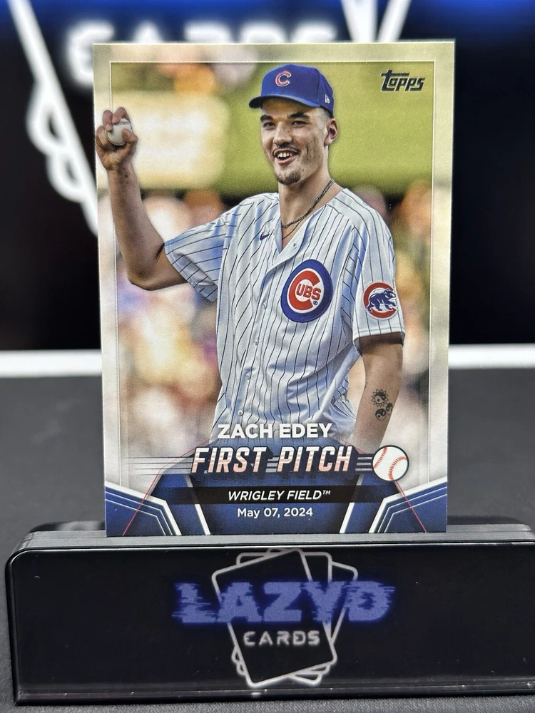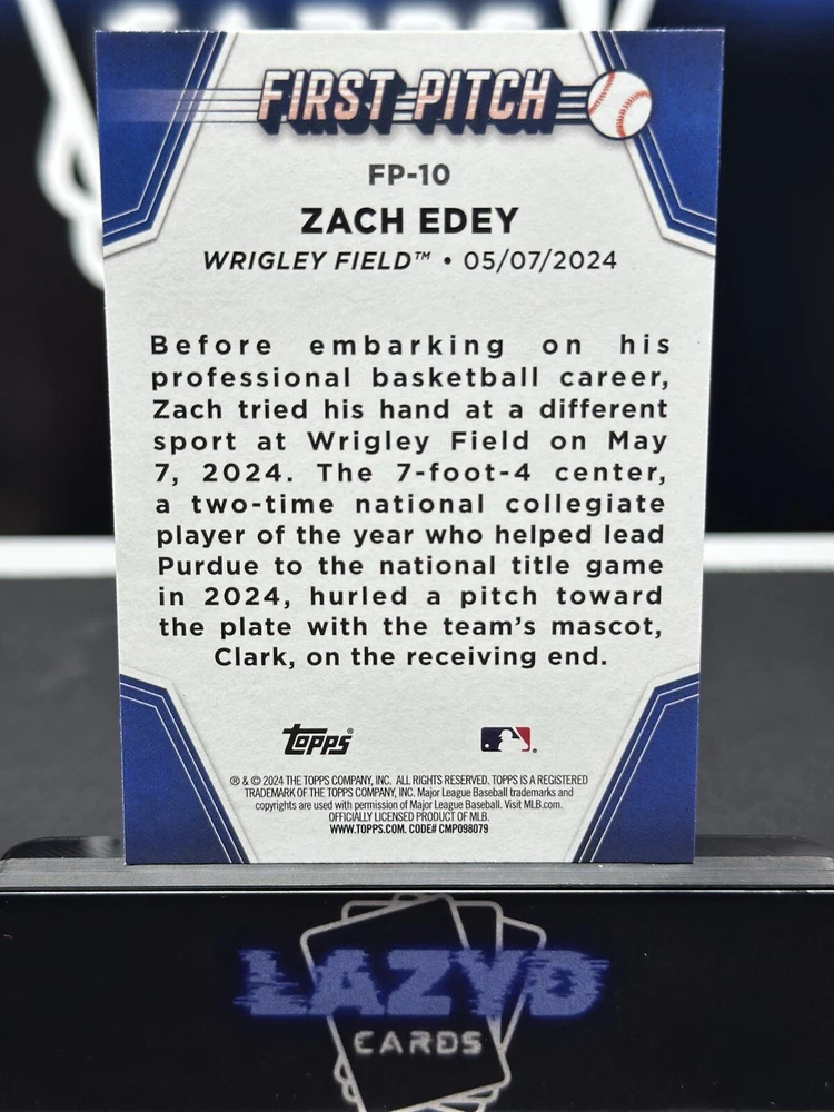 This 2024 Topps Update First Pitch trading card features Zach Edey of the Chicago Cubs. The card is part of the 2024 Topps Update Series and is an original, ungraded, and near mint or better conditioned card. The card number is FP-10 and it is a single card with an insert parallel/variety. The card is perfect for Major League Baseball (MLB) fans and collectors who are looking for a rookie card of Zach Edey. The card is not autographed and is not a vintage or licensed reprint. It is a great addition to any sports trading card collection and is a must-have for fans of the Chicago Cubs.