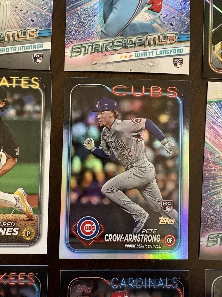 This 2024 Topps Update Series trading card features Pete Crow-Armstrong and Jackson Holliday, two rising stars in baseball. The card is a Rainbow Foil parallel/variety, adding a unique touch to your collection. The card is in excellent shape, with a Near Mint or better grade. It is a great addition to any sports trading card collection, especially those interested in baseball. Don't miss out on the opportunity to own a piece of the 2024 season with this Jackson Holliday Pete Crow-Armstrong Rainbow Foil card.