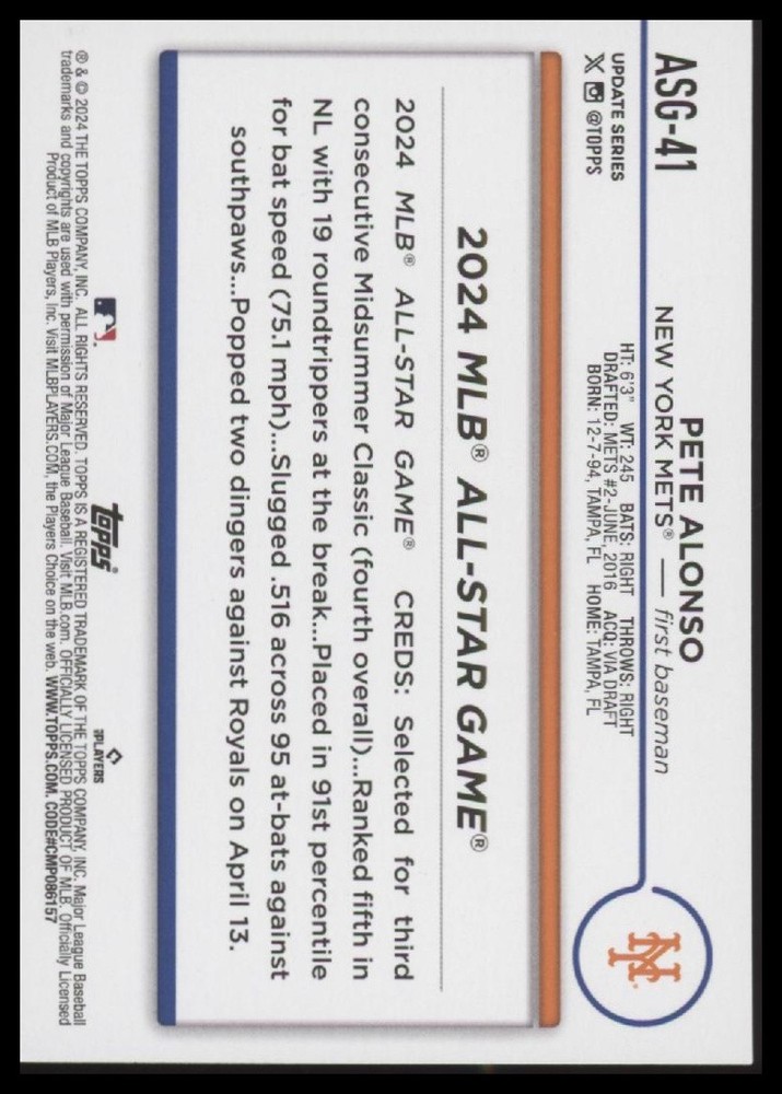 This is a nice example of a 2024 Topps Update #ASG-41 Pete Alonso All-Star Game Other important information about this card: In 2024 Pete Alonso played for the Mets. Please check out our other listings for more great cards.