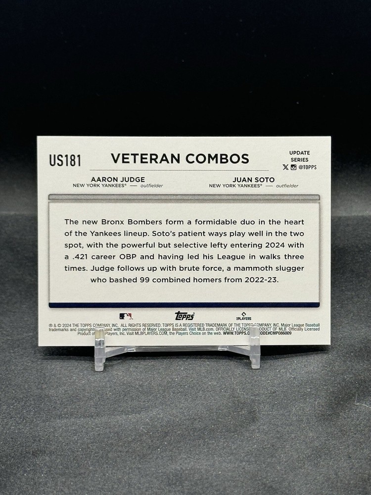2024 Topps Update Series Bronx Bombers Aaron Judge and Juan Soto Retail Royal Blue Parallel - New York Yankees - card #US181 Please reach out to us and check out our other items listed on eBay if you are looking for singles, inserts, lots, etc. from this set or any others - We have plenty of extras of base cards, as well as inserts!! Also, please feel free to message us with any questions you might have regarding the photos. Most of our cards were opened from packs and went directly into soft “penny” sleeve and into a hard card (handled with care). Shipping We do offer combined shipping for anyone who purchases more than one item from us. Simply message us when you are finished shopping, and we will send a combined invoice with the discounted shipping on it. All cards will be carefully placed inside a soft “penny” sleeve, hard card, team bag, and then between two pieces of cardboard and secured inside a bubbled envelope (unless you pay for eBay Standard envelope). If the items do not fit inside a bubbled envelope, then we will put cards in a plastic case, and ship the item inside a small box using air bags, packing peanuts, bubble wrap, etc. and make sure the item(s) are carefully packaged and secured. If you prefer to save on shipping, we do offer the eBay standard envelope shipping rate of $1.15 for cards/items that weigh less than three ounces, and the card price is less than $20 for the card. Be sure to choose the preferred shipping method when you checkout, as we do offer a couple of shipping options for you. If you purchase a complete set, then we will carefully package your item using bubble wrap, air bags, and/or packing peanuts to make sure your item arrives safely. Be sure to check out our feedback messages and see what other buyers are saying about us. All items will carefully ship within 24 hours of receiving confirmed payment. Thanks for checking out our items and we hope to do business with you!!
